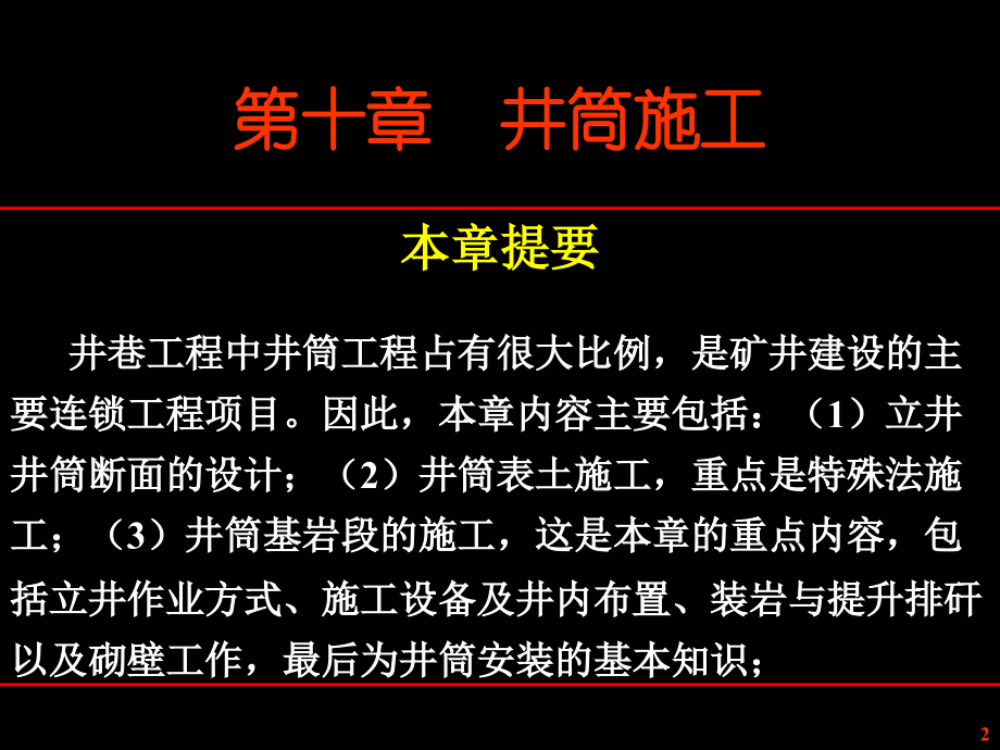 ,单击此处编辑母版标题样式,单击此处编辑母版文本样式,第二级,第三级,第四级,第五级,*,1,第十章 井筒施工,本章提要,井巷工程中井筒工程占有很大比例,是矿井建设的主要连锁工程项目。因此,本章内容主要包括:(,1,)立井井筒断面的设计;(,2,)井筒表土施工,重点是特殊法施工;(,3,)井筒基岩段的施工,这是本章的重点内容,包括立井作业方式、施工设备及井内布置、装岩与提升排矸以及砌壁工作,最后为井筒安装的基本知识;,2,参考文献:,龙志阳,.,中国煤矿井巷施工技术现状。,何东春,黄跃东,邓洪义,.,煤炭技术,.,立井井筒机械化配套快速施工,.2004,年,7,月第,23,卷第,7,期,:,7778,张梦彪,.,深立井综合机械化快速施工技术,.,建井技术,.2002,年,2,月,.,第,23,卷第,1,期,:3739,韩文利,.,宣东二矿主井井筒优质快速施工,.,建井技术,.2002,年,2,月,.,第,23,卷第,1,期,:1618,杨杰,冯孝生,.,岱庄矿风井井筒基岩段施工技术,.2002,年,8,月,.,第,23,卷第,4,期,:14,3,第一节 概述,一井筒分类(主井、付井、风井),1,主井 提升煤炭,箕斗,4,2,副井 提升矸石、上下人员、设备、材料、进风,罐笼,3,风井 回风、安全出口,梯子,5,二、井筒结构,1.,井颈:,深度:,15,20m,壁厚:钢筋混凝土井壁,(上段,1.01.5m,,中段,0.6,0.9m,,下段,0.40.7m,),2.,井身:,至罐笼进出车水平或箕斗装载水平,表土段及风化基岩段:双层井壁,总厚,600,700mm,基岩段:素混凝土井壁,厚,300,400mm,3.,井底,付井,10m,,主井,35,75m,,风井,4,6m,6,孔洞名称,断面积,m2,孔顶距井口距离,m,用途,安全通道,1.2,2.0,在防火门以下,防火门封闭时疏散井下人员及进风,暖风通道,28,1.56,严寒地区防止冬季井筒结冰和保证井下人员的正常工作,通风通道,420,37,通风井筒出风用,排水管孔,1.54,23,通过排水管用,压风管口,1.01.5,23,通过压风管用,电缆孔,0.81.0,12,通过电缆用,井颈段的各种孔道,7,三施工特点,1.,工程量不大,但工期长。,煤矿建设中,立井井筒施工是关键工程。虽然立井井筒掘进工程量仅占全矿井工程量的,4,5,,但工期却占,35,左右。因此,加快立井掘砌速度,是缩短矿井建设工期的关键。而立井作业方式、施工技术及装备水平又影响着立井的掘砌速度。,50,年来,经过广大建设者的努力,目前我国立井机械化装备水平与施工速度已达到当代国际先进水平。,8,2.,施工复杂,立井井筒一般要穿过表土与基岩两个部分,其施工技术由于围岩条件不同各有特点。表土施工方案选择主要考虑工程的安全,而基岩施工主要考虑施工速度。,由于,表土松软,稳定性较差,经常含水,并直接承受井口结构物的荷载。,所以,表土施工比较复杂,往往成为立井施工的关键工程。正确的选择表土施工方案和施工方法,避开雨季施工,预先考虑片帮等突发事故的防范措施,确保立井井筒安全快速地通过表土层,并顺利转入基岩施工具有重要的意义。,9,立井井筒施工包括掘进、砌壁和安装三大工序,井筒正式掘进之前,先在井口上方设置,井架,,在井架顶部安装,天轮平台,,在井架第一平台标高处安设,卸矸平台,。与此同时,掘进井筒上口一段井筒,安设,临时锁口、封口盘、固定盘和吊盘,,在井口四周安装,凿井提升机、凿井绞车、悬吊凿井,用的各种施工设备及管线;建筑凿井用的,压风机房,、,通风机房和混凝土搅拌站,等辅助生产车间。待一切准备工作完成后,即可进行井简的正式掘进工作。,立井基岩施工主要采用钻眼爆破方法。根据井筒掘砌作业方式的不同,,拆模、立模、浇较混凝土等,砌壁工作可在掘进工作面或吊盘上进行。混凝土在地面井口搅拌站配制,经混凝土输送管或底卸式吊桶送至砌壁作业地点,当这段井筒砌好后,再转入下段井筒的掘进作业,依此往复循环直至井街最终深度。,10,3.,安全工作,2004.3.18,,山东省枣庄市滕州市东大煤矿副井(基建井,由中国中煤能源集团公司五建公司第二工程处承建)发生提升过卷坠罐事故,井下共有,11,人(罐内,2,人,抓岩机内,1,人,井底工作面,8,人)作业,其中:,7,人死亡,,1,人重伤,,3,人轻伤。,事故的主要原因是管理人员违章操作。按照规程,主要提升绞车必须配备正、副司机,正司机操作、副司机监护,但东大项目部分为四个班次进行作业,只有名绞车司机,特殊工种人员严重不足;此外,绞车本身速度保护装置不全、过卷高度不足也是造成这一事故的重要原因。,11,1988,年,1,月,13,日中午,山东省张家洼矿山公司所属的井巷工程公司安装队,发生了一起死亡,7,人,重伤多人的重大恶性事故。,当天上午,7,点半,安装队到张矿主井执行吊桶改罐施工的落盘任务,要把在井深,434,米的三层吊盘降到井深,506,米处。参加施工的职工有,18,人在井内工作,其中,14,人在吊盘上工作。吊盘悬吊在井内,直径为,7.3,米。三层吊盘上分别站有,7,人、,4,人、,3,人,负责放电缆、看稳绳、通讯、指挥。,8,点左右,开始落盘(井内作垂直下落)。在落盘过程中,盘上工作人员发现有,4,根钢丝绳悬吊的吊盘下落不平衡。井下指挥人员马上同地面电话联系,随即连续四次进行调整。上午,10,点,40,分,吊盘从井下,434,米处落到井下,456,米码头门(进巷道的口)时,盘上工人突然听到响声,随即西北角一根直径,34,毫米的悬吊钢丝绳发生断裂。刹那间,井内灯灭了,盘上与井口的信号联系中断,三层吊盘同时倾斜,75,以上,有,9,人坠入离作业面,60,多米的,“,深渊,”,。,造成这起事故的直接原因是悬吊吊盘的钢丝绳断裂。,12,50,60,年代,立井施工作业方