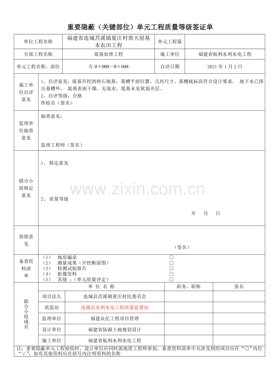 重要隐蔽(关键部位)单元工程质量等级签证单