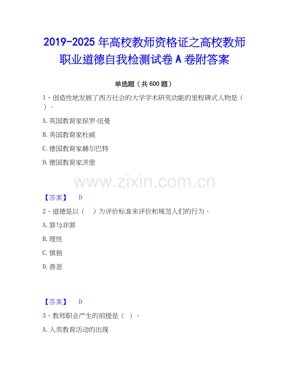 2019-2025年高校教师资格证之高校教师职业道德自我检测试卷A卷附答案