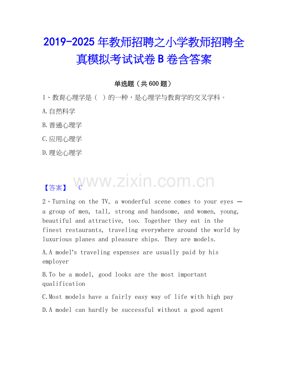 2019-2025年教师招聘之小学教师招聘全真模拟考试试卷B卷含答案