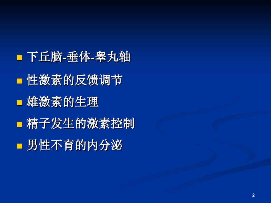 ,*,单击此处编辑母版标题样式,单击此处编辑母版文本样式,第二级,第三级,第四级,第五级,男性生殖内分泌基础理论,吉大一院生殖中心,王群,1,下丘脑,-,垂体,-,睾丸轴,性激素的反馈调节,雄激素的生理,精子发生的激素控制,男性不育的内分泌,2,下丘脑,-,垂体,-,睾丸轴,3,下丘脑激素的分泌,GnRH,由下丘脑分泌,通过垂体门脉系统到达垂体前叶,刺激,FSH/LH,的合成与分泌。,每,70-90,分钟一次脉冲,半衰期,2-5,分钟。,受到来自,Gn,和睾丸激素的反馈调节。,影响因素:年龄、饮食、应激、锻炼等。,4,垂体激素的分泌,FSH,和,LH,,糖蛋白,脉冲式分泌,血液浓度可存在很大波动,调控:,GnRH,反馈调节:睾丸激素(,T,、,E2,、,Inhibin,等),5,睾丸的内分泌,睾丸的两大功能:精子发生,/,性激素的分泌。,LH,作用于睾丸间质中的,Leydig,细胞,刺激产生睾酮;,FSH,作用于生精小管的,Sertoli,细胞,调控精子的发生、雄激素结合蛋白以及芳香化酶的合成。,6,睾丸的内分泌,成年男性雄激素分泌特点,时节率:每天,1520,个脉冲,振幅,50200ng/dl,日节率:,810AM,最高,睡前最低,高低相差,30%,;性腺功能减退者此节律消失,青春发育初期与此相反,高,PRL,致性腺功能减退者,此节律增强,月周期:男性不明显,年周期:每年,1012,月份为睾酮最高水平,生命周期:老年男性睾酮水平逐渐降低,7,性激素的反馈调节,下丘脑,-,垂体,-,睾丸轴 闭合的反馈系统,GnRH,FSH/LH,睾酮,/,抑制素,/,激活素,睾酮、,DHT,、雌二醇均可抑制,FSH/LH,的分泌,在垂体和下丘脑水平;,抑制素(,Inhibin,)和激活素(,Activin,)来自,Sertoli,细胞,分别可以抑制和促进,FSH,的分泌;,另外,其他肽类因子,如,follistatin,、转化生长因子,B,(,TGF-B,)等也可调节,FSH,的分泌。,8,雄激素的生理,组成:游离睾酮(,2%,)、结合于白蛋白或其他蛋白(,54%,)、结合于,SHBG,(,44%,)。,生理作用:调节,Gn,分泌、启动和维持生精、男性性别分化、男性性成熟、控制性欲和勃起。,睾酮(,T,)由睾丸间质细胞(,Leydig,)以脉冲式分泌,清早高峰,夜间低谷,每日产量,5mg,。可转化为,DHT,,发挥相应作用。,Free,Albumin,SHBG,生物活性,结合雄激素,9,10,精子发生的激素控制,主要受,FSH,和,LH,的控制。,LH,作用于,Leydig,细胞,促进内源性雄激素的产生,从而影响精子发生。,Sertoli,细胞具有,FSH,受体,可接受,FSH,的调控;同时可以产生雄激素结合蛋白,将雄激素结合并转运到生精小管腔内,维持局部的高浓度的雄激素,形成生精所需的微环境。,11,睾丸结构,LH,T T,T T T T,T T,FSH,ABP ABP-T,ABP-T ABP-T T,睾丸局部睾酮浓度,=,血液睾酮浓度,200400,12,男性不育的内分泌原因分类,高促性腺性性腺功能减低,原发性性腺功能减低,LH/FSH,增高而睾丸功能减低,低促性腺性性腺功能减低,继发性性腺功能减低,LH/FSH,减低而睾丸功能减低,13,高促性腺性性腺功能减低,染色体疾病,肌强直萎缩(,Myotonic dystrophy,),无睾症,唯支持细胞综合征(,SCOS,),生殖毒素(药物、毒物、放射线),睾丸炎,系统性疾病(慢性肾衰、肝硬化、镰刀细胞病等),雄激素抵抗综合征,14,染色体疾病,常染色体畸变:易位、倒位、三体、单体,Y,染色体微缺失:,AZFa,、,AZFb,、,AZFc,、,AZFd,Klinefilter,s syndrome,:,47,,,XXY,,,1/500,,小而硬的睾丸、男性化不足、无精子症、乳房女性化,臂展,身长。,FSH/LH,升高,,T,正常或减低,,E2,升高。可能需要雄激素替代治疗。,性反转:,46,,,XX,男性,,1/9000,。类似克氏症,但通常身高较矮,尿道下裂多见。,15,生殖毒素,药物:机制不一,化疗药物、西米替丁、毒品(大麻、海洛因等)、硫氮磺胺吡啶、氧氟沙星、环丙孕酮、酮康唑、螺内酯等。,放射线:直接损伤生精上皮,小剂量可逆,大剂量可造成永久损伤。,环境毒素:杀虫剂、重金属、有机溶剂等。,16,影响睾丸功能和,/,或引发乳房发育的药物,抗雄激素药物 抗肿瘤药物,螺内酯,(,安体舒通,),环磷酰胺,醋酸赛普龙,(CPA),左旋苯丙氨酸氮芥,西米替丁 苯丁酸氮芥,氟他胺 盐酸甲基苄肼,雌激素和其他激素 精神性药物,雌激素类似物 三环类抗抑郁药,绒毛膜促性腺激素,(hCG),安菲他明,类固醇激素 麻醉剂,抗高血压,/,心血管药物,镇静剂,-,甲基多巴,其他类药,地高辛 苯妥因,钙通道阻滞剂 乙醇,利血平 青酶胺,ACEI(,罕见,),异烟肼,雄激素抑制剂,酮康唑,亮普瑞林,(Leuprolide),17,肌强直萎缩:青春发育正常,,3040,岁出现睾丸生精功能衰退,,FSH,升高、睾丸萎缩,而,LH,、,T,正常。,无睾症:,1/20000,,找不到睾丸,性成熟缺乏,核型正常,可能因创伤、感染等因素造成,鉴别双侧隐睾(,HCG,试验)。,SCOS,:睾丸活检仅见到支持细胞。,18,睾丸炎:成年后的腮腺炎患者中,20%,左右会发生睾丸炎,其中,10%,左右为双侧,双侧患者中能够恢复正常精液者不足,1/3,。,系统性疾病:慢性肾衰、肝硬化、镰刀细胞病,雄激素抵抗综合征:雄激素受体异常或,5-,还原酶异常,表型差异很大,,T,、,LH,均明显升高。,19,低促性腺性性腺功能减低,Kallmann,s syndrome,单独,LH,不足,单独,FSH,不足,先天性低促性腺综合征,垂体疾病,雌激素过多,雄激素过多,高泌乳素血症,糖皮质激素过多,甲亢和甲减,20,Kallmanns syndrome,1/10,000,,仅次于克氏症的性腺功能低下的原因,FSH/LH,不足,垂体的其他功能不受损,伴有或不伴有嗅觉丧失,可伴有先天性耳聋、唇腭裂、面部不对称、肾脏畸形、色盲等先天性异常。,表现:小阴茎、隐睾、性成熟延迟,睾丸直径小于,2cm,。血液,T,明显减低,,FSH/LH,减低或处于正常范围下限。,21,Kallmanns syndrome,22,单独,LH,不足,“,Fertile Eunuch,”