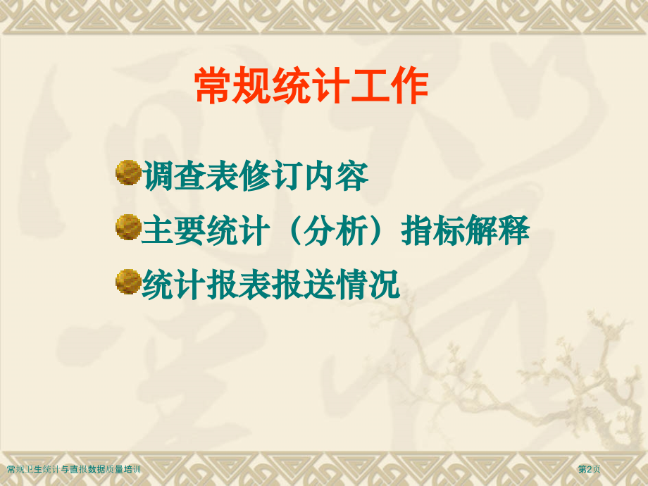 单击此处编辑母版标题样式,单击此处编辑母版文本样式,第二级,第三级,第四级,第五级,#,常规卫生统计与直报数据质量培训,常规卫生统计与直报数据质量培训,第1页,常规统计工作,调查表修订内容,主要统计(分析)指标解释,统计报表报送情况,常规卫生统计与直报数据质量培训,第2页,一、调查表修订内容,(,一,),合并月报表,年,7,月起执行新月报制度,将二级以上医院月报表(卫统,1-9,表)和其它医疗机构月报表(卫统,1-10,表)合并为医疗服务月报表(卫统,1-9,表),修订内容:,取消医疗服务质量指标,调整收支指标,门诊收入包含门诊药品收入,住院收入包含住院药品收入,以及其中基础药品收入,增加公立医院改革指标,5.1-5.13,项指标,常规卫生统计与直报数据质量培训,第3页,公立医院改革项目,第五点公立医院项目,只须公立医院填报,私立医院、乡镇卫生院、小区服务中心第五大点无须填报。其中,5.1-5.10,为逻辑性审核必填指标,,5.1,除公立医院改革试点医院外,其它公立医院全部填“否”。,5.2,现公立医院还未实施基础药品制度,填“否”,其它指标按照本医院实际情况填列。,常规卫生统计与直报数据质量培训,第4页,一、调查表修订内容,(,续,),(,二,),调整报送时间(同直报,6,号公告),月报表:,医疗卫生机构报送日期为次月,15,日前,省级数据上传时间提前至,20,日,季报表:,截至,年第,4,季报,全部三级医院和上报数据二级医院卫统,4,表,报送时间推迟为,年,2,月,20,日,医改监测表,年第二期医改监测表要求各填报单位在,12,月,10,日前上报数据。,年报表,卫统,1-1,、,1-2,、,1-3,、,1-5,、,1-6,、,1-7,、,1-8,表报送日期为,年,1,月,20,日前。,卫统,1-4,村卫生室年报延期至,年,2,月,20,日前上报。,常规卫生统计与直报数据质量培训,第5页,年和,年直报时间,汇报期,表名,直报时间,月报,医疗服务月报表,(,卫统,1-9,表,),次月,1-15,日,(,不报,12,月数,直接报年报,),年报,卫生机构年报表,(,卫统,1-1,表至卫统,1-8,表,),第二年1月1-20日,,1-4表2月20日上报,实时报,卫生人力信息表,(,卫统,2,表,),新增人员1个月内上报,7-9月更新现有职员变动信息,医用设备调查表,(,卫统,3,表,),购置设备,1,月内上报,新增卫生机构,增减机构,1,个月内上报,季报,出院病人调查表,(,卫统,4,表,),季后,1,个月内,注:截止汇报期5日内系统自动上传本省数据,上传不成功则次日手动上传。,常规卫生统计与直报数据质量培训,第6页,直报时间,医改监测表上报时段,汇报期,统计时段,填报单位直,报时段,省级审核数,据时段,首次抓取数,据时间,部级审核结果,反馈省级确认,时段,再次上传数,据时间,第,1,期,3月1日,7,月,7,月,15,日,7,月,16-18,日,7,月,19,日,-6,月,30,日,7,月,1-10,日,10-15,日,24,时,12,时前,第,2,期,3月1日,12,月,12,月,15,日,12,月,16-18,日,12,月,19,日,-11,月,30,日,12,月,1-10,日,10-15,日,24,时,12,时前,第,3,期,3月1日,2,月,2,月,15,日,2,月,16-18,日,2,月,19,日,-1月31日,2,月,1-10,日,10-15,日,24,时,12,时前,常规卫生统计与直报数据质量培训,第7页,二、主要统计(分析)指标解释,医疗卫生机构:,包含医院、基层医疗卫生机构、专业公共卫生机构、其它医疗卫生机构。,基层医疗卫生机构,:,包含小区卫生服务中心(站)、街道卫生院、乡镇卫生院、村卫生室、门诊部、诊所(医务室)。,专业公共卫生机构,:,包含疾病预防控制中心、专科疾病防治机构、妇幼保健机构、健康教育机构、抢救中心(站)、采供血机构、卫生监督机构、卫生部门主管计划生育技术服务中心。不包含传染病院、结核病医院、血防医院、精神病医院、卫生监督(监测、检测)机构。,其它医疗卫生机构:,包含疗养院、临床检验中心、医学科研机构、医学在职教育机构、医学考试中心、农村改水中心、人才交流中心、统计信息中心等卫生事业单位。,常规卫生统计与直报数据质量培训,第8页,二、主要统计(分析)指标解释,政府办基层医疗卫生机构:,包含卫生、乡镇政府、街道办等行政部门举行乡镇卫生院和小区卫生服务中心(站)。,政府办小区卫生服务中心(站),:,包含卫生行政部门、街道办事处等行政部门和政府办医院举行小区卫生服务中心或小区卫生服务站。,公立医院:,指经济类型为国有和集体医院。政府办医院均为公立医院。,民营医院:,指公立医院以外其它医院,包含联营、股份合作、私营、港澳合作、中外合作等医院。,常规卫生统计与直报数据质量培训,第9页,二、主要统计(分析)指标解释,在岗职员数:,指在各类医疗卫生机构工作并由单位支付工资在岗人员。包含在编及协议制人员、返聘本单位六个月以上人员,、,临聘本单位六个月以上注册护士,。,分为卫生技术人员、,乡村医生和卫生员,、其它技术人员、管理人员和工勤技能人员。,收入与支出、资产与负债,:,与,医院会计制度,、,基层医疗卫生机构会计制度,指标解释一致。普通直接过录财务数字。,年起执行新,医院会计制度,。,住院医疗服务各项数字,:,应以,住院病案首页,为依据,应与出院病人调查表数据库一致。,诊疗人次数:,不包含全身体检和预防接种人次数。,城镇划分,:,城市包含省辖市区和地辖市区;农村包含县和县级市,乡镇卫生院和村卫生室计入农村。,常规卫生统计与直报数据质量培训,第10页,二、主要统计(分析)指标解释,病床使用率,=,实际占用总床日数,/,实际开放总床日数,医师人均每日负担诊疗人次,=,(诊疗人次数,/,医师数),/,当月天