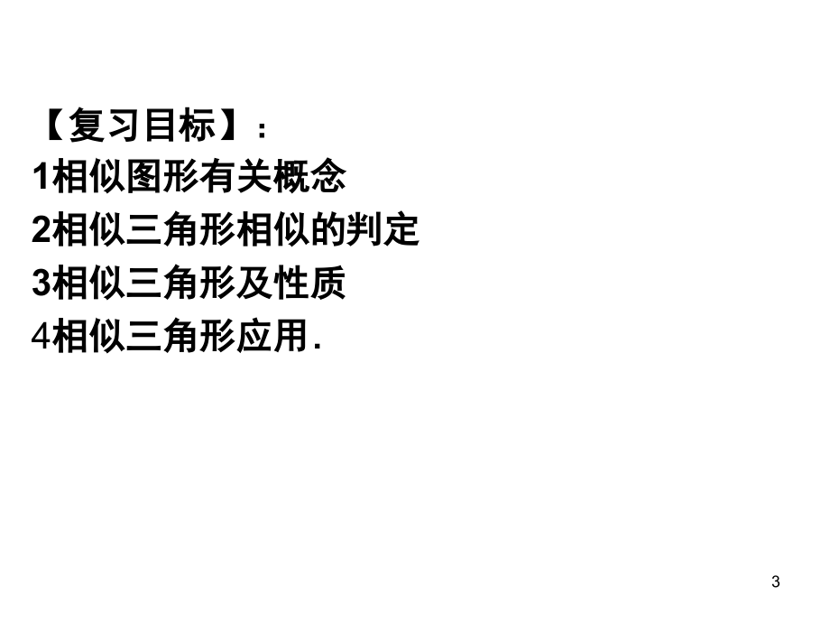 单击此处编辑母版标题样式,单击此处编辑母版文本样式,第二级,第三级,第四级,第五级,*,十八、相似三角形,(,复习,),1,(1)请同学们独立解决上述问题,解决不了的组长组织好组内同学讲解,(2)组内讨论在解决上述问题中用到的相似三角形的知识,(3)除上述证明三角形相似的判定外,还有那些证明三角形相似的方法?,情景导入,2,【,复习目标,】,:,1,相似图形有关概念,2,相似三角形相似的判定,3,相似三角形及性质,4,相似三角形应用,3,【,知识梳理,】,知识点一:相似的有关概念,(一)导学回顾:,1.,的图形称为相似多边形基本性质,_,2.,成比例线段指的是,.,(二)自主学习,:,1,.,已知线段,a=2cm,,,b=3cm,,,c=4cm,,若要添加一条线段,d,,使,a,、,b,、,c,、,d,为成比例线段,则,d=,cm.,2.,若,=,则,3a=_,,,4,3如图所示,在长为8cm,宽为6cm的矩形中,截去一个矩形(图中阴影部分),如果剩下的矩形与原矩形相似,那么剩下矩形的面积是 (),A 28cm,2,B 27cm,2,C 21cm,2,D 20cm,2,知识点二:相似三角形的判定,导学回顾,:,1,、平行线分线段成比例定理:,_ .,2,平行线分线段成比例定理的推论,.,3.,相似三角形的判定方法:,预备定理、三边判定法、两边及夹角判定法、两角判定法、斜边直角边判定法,5,(二)自主学习,1.,下列四个三角形中,与左图中的三角形相似的是(),(第,1,题),A,B,C,D,6,2.,在直角梯形,ABCD,中,.AD=7 AB=2 DC=3 P,为,AD,上一点,以,P,、,A,、,B,的顶点的三角形与,P,、,D,、,C,为顶点的三角形相似,那么这样的点,P,有几个,?,为什么,?,.,C,B,D,A,P,7,知识点三:相似三角形的性质,导学回顾,:,1.,基本性质,2.,相似三角形的对应高的比、对应中线的比、对应角平分线的比都,.,3.,相似三角形的周长的比等于,.,相似三角形的面积的比等于,.,(二)自主学习:,1.,如果两个相似三角形的相似比是3:5,周长的差为4cm,那么较大三角形的周长为,cm。,8,2.,两个相似三角形的面积比为,4:9,那么它们周长的比为,.,3.,已知:如图,,PMN,是等边三角形,,APB=120.,求证:,AMPB=PNAP,。,知识点四:相似三角形的应用,(一)导学回顾,:相似三角形在实际生活中有着广泛的应用,其中最常见的题型是计算不容易直接测量的物体的高度、测量不能到达的两点间的的距离等,常用的方法有:,1,、阳光下同一时刻,不同物体的高度与影长对应,.,2,、构建相似三角形模型,利用相似三角形的判定与性质进行计算。,P,N,M,A,B,9,(二)自主学习,:,如图,王华晚上由路灯,A,下的,B,处走到,C,处时,测得影子,CD,的长为,1,米,继续往前走,2,米到达,E,处时,测得影子,EF,的长为,2,米,已知王华的身高是,1.5,米,那么路灯,A,的高度等于(),A,4.5,米,B,6,米,C,7.2,米,D,8,10,【,典型例题,】,一,如图,在,ABC,中,,D,、,E,分别是,AB,、,AC,上的点,,DC,交,BE,于,F,,且,AD,:,AB=1,:,3,,,AE=1/2EC,,求证:,(,1,),ADEABC,;,(,2,),DFBF=EFCF,11,月考,20,题,.,(,2012,日照)如图,在正方形,ABCD,中,,E,是,BC,上的一点,连结,AE,,作,BF,AE,,垂足为,H,交,CD,于,F,作,CG,AE,交,BF,于,G,.(1),求证,:,CG,=,BH,;(2)=,BFGF,;(3),=,【,典型例题,】,二,12,【,总结反思,】,1,相似图形有关概念,2,相似三角形相似的判定,3,相似三角形及性质,4,相似三角形应用,13,课外作业(午自习),1.,在平行四边形,ABCD,中,AE:BE=1:2.,若,SAEF=6 ,则,SCDF=,SADF=_.,2.,如图,ABC,中,,C=90,,,BC=8cm,,,AB,10cm,,点,P,从,B,点出发,沿,BC,方向以,2m/s,的速度移动,点,Q,从,C,出发,沿,CA,方向以,1m/s,的速度移动。若,P,、,Q,同时分别从,B,、,C,出发,经过多少秒,CPQ,与,CBA,相似?,A,C,Q,P,B,14,【,中考链接,】,1.,(,2010,日照)如图,在,ABC,中,,AB,=,AC,,以,AB,为直径的,O,交,AC,与,E,,交,BC,与,D,求证:,(,1,),D,是,BC,的中点;(,2,),BEC,ADC,;,(,3,),=2,AB,CE,2.,(,2011,日照)如图,,AB,是,O,的直径,,AC,是弦,,CD,是,O,的切线,,C,为切点,,AD,CD,于点,D,求证:(,1,),AOC,=2,ACD,;,(,2,),AB,AD,15,晚自习,单元测试A卷:17、18、19、20,16,
