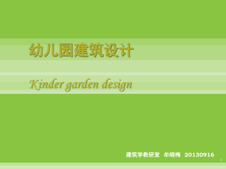 单击此处编辑母版标题样式,单击此处编辑母版文本样式,第二级,第三级,第四级,第五级,*,*,单击此处编辑母版标题样式,单击此处编辑母版文本样式,第二级,第三级,第四级,第五级,*,*,单击此处编辑母版标题样式,单击此处编辑母版文本样式,第二级,第三级,第四级,第五级,*,*,单击此处编辑母版标题样式,单击此处编辑母版文本样式,第二级,第三级,第四级,第五级,*,*,建筑学教研室 牟晓梅,20130916,幼儿园建筑设计,Kinder garden design,1,1.,幼儿园调研报告,2.,幼儿园设计要点,3.,图纸表达,内容,2,一、对幼儿园设计的理解,1,2,3,内部空间,安全问题,建筑外表,幼儿园的外表和色彩应该明亮活泼,充满童趣。,班单元的游戏空间应保证足够的日照。,在将屋顶作为室外活动场地时,必须做好严密防护措施。,所有的班级房间对外视野均应开阔,富含趣味。,3,实例分析,3.,室外场地实例,2.,内部设计实例,1.,班单元实例,Kindergarten Barbapap,巴巴爸爸幼儿园,【,意大利,】,Kindergartens,童趣幼儿园,【,瑞典,】,2.,内部设计实例,2.,内部设计实例,3.,室外场地实例,3.,室外场地实例,Katarina Frankopan Kindergarten,【,克罗地亚,】,3.,室外场地实例,4,Kindergarten Barbapap【,意大利,】,用地面积:,5,600,平方米,建筑师:,CCD,建筑工作室,地点:德维尼奥拉市,意大利,项目面积:,1158,平方米,项目年份:,2008-2009,5,班单元正立面,正立面采用大面积彩色玻璃,采光充裕,颜色活泼充满童趣。,不规则立面体现了幼儿园趣味和童真的一面。,6,卧室,游戏室,隔 断,卧室和活动室呈半开放状态,符合幼儿的活泼天性。,班单元活动室与卧室,7,活动室主体阳光充裕,视野开阔。,面积开敞,灵活性大。,8,小活动室,班级相连,有助于不同,班级幼儿的,沟通交流,室外小操,场阶梯,可供幼儿,坐下观赏,表演,班单元后方设计,9,班级后方实验室,班级间活动室的相通,为幼儿交流提供了条件。,采用天窗采光,克服了进深长光线弱的问题。,盥洗室开放设置与活动室一起,充分体现了人性化。,10,幼儿园实例分析二,Kindergartens,童趣幼儿园,【,瑞典,】,11,阳光照射充满趣味性,色彩明媚亮丽,造型丰富多样,内墙设计,(,PLAY WALL,),墙体仿照奶酪设计,充满喜剧感,不规则穿洞的墙体成为儿童游戏的一部分,单纯明亮的色彩能吸引儿童,12,实例分析三,Katarina Frankopan Kinderarten,【,克罗地亚,】,项目面积:,1725,施工日期:,2009,年,建筑师:兰迪奇图拉托,地点:克尔克岛,克罗地亚,13,人员出入口,货车出入口,主干道,次干道,幼儿园外围环境,14,室内方面,班单元间要创造互动交流的空间,方便幼儿沟通。,室外方面,人员与车辆出入口应分别设置,保证幼儿出入安全。,无论在建筑立面,还是内部设计方面,都要想儿童所想,,创造令幼儿感兴趣,喜爱,舒适的空间环境,。,幼儿所在的活动地点都必须拥有充足的日照。,采 光,趣味性,交 通,总结,15,1.,幼儿园调研报告,2.,幼儿园设计要点,设计之前必需掌握的基础知识,3.,图纸表达,内容,16,幼儿园建筑的定义,托儿所、幼儿园是对幼儿进行保育和教育的机构接纳三周以下幼儿的为托儿所,接纳,3,6,周岁幼儿的为幼儿园,宗旨:对幼儿进行体、德、智、美诸方面全面发展的教育,促进儿童身心健全发展的保育和教育机构,一般学制三年。,幼儿园的分类,按照幼儿在园时段方式分:全日制 寄宿制,按建设方式分:独立地段新建幼儿园 已有建筑附属新建幼儿园 已有建筑改建幼儿园,按办学规模分:大型(,10,12,班)中型(,6,9,班)小型(,5,班以下),幼儿园的规模,大,:,10,12,班以上;中:,6,9,班;小:,5,班以下。,幼儿园发展历史,1827,年德国人福禄贝尔在,Blandenberg,创立世界上第一所幼儿园,至今有,180,余年历史。,我国第一所幼儿园创办于,1903,年。,幼儿园的特殊性,来源于幼儿生理、心理、行为特点及相应的保育需要。,17,幼儿教育的重要性,根据心理学和教育学的研究成果,儿童早期是智力迅速发展的时期,人的智力,是在进入小学以前形成的,因此发展和改善幼儿教育已成为各国教育改革中的重要课题。,由于社会发展需要,父母均需工作,因此孩子由幼儿园照管使双亲有更多时间与精力投入社会工作与生活。,独生子女易受骄养,形成自我中心,同时缺少兄弟姐妹的互相关照,难以形成合群的性格,学校提供了集体生活的体验,使孩子懂得如何融入社会生活,学习平等,友爱。,幼儿教育应使儿童的社会性与个性充分发展相协调。,幼儿身心发展特征与规律,学前儿童身体处于迅速生长发育时期,身体各部分组织器官的发育和成熟都是很快的,(身高、体重、骨骼、肌由)基于一定生物学规律(遗传),后天营养、运动、医疗保健、阳光、新鲜空气,3,岁前儿童的思维特点是直觉行动性的,,3,岁后儿童以具体形象性思维为特征,逐渐发展着简单的逻辑性思维。,18,19,学校的环境可分,软件,指以授业学习为轴,老师与学生间所构成的一种教育气氛及人际关系;,硬件,相对于软件领域所需配合的物质条件和设施)。幼稚园的建筑设备构成幼儿教育环境的重要组成部分,应能提供儿童发育其能力的活动及练习所需的条件。儿童是观察者与探索者,需赖以吸收环境中各种印象以建建其心智,所以环境成为儿童寻求适应的媒介。,幼儿园舍应使儿童感觉像,家,一样,充满温暖、吸引力及安全感。,理想的校舍不但能使师生教学便利,更能促进身心健康,优美的环境能陶冶情操,培养审美观念;适当的教具、玩具可激发,学习,兴趣,