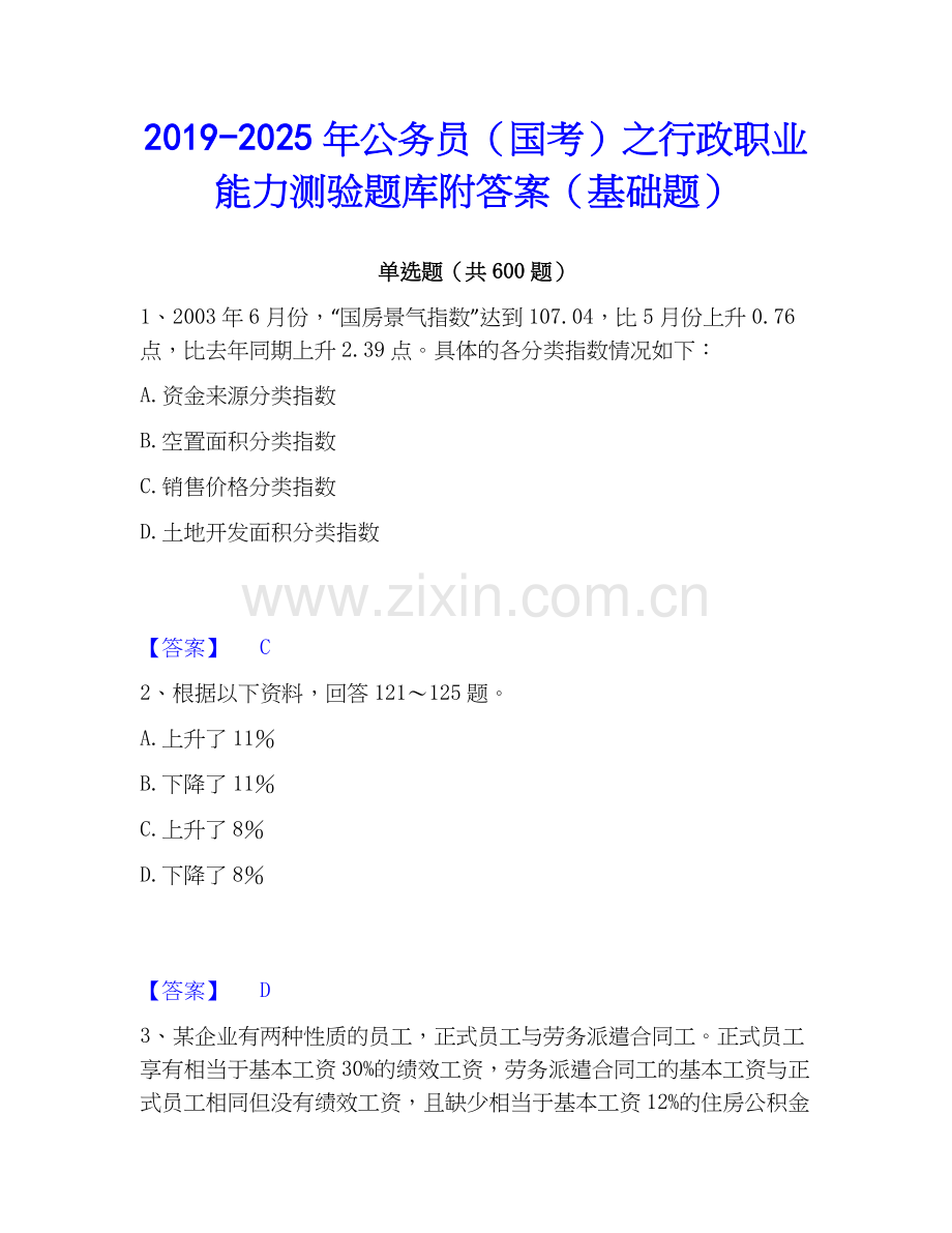 2019-2025年公务员(国考)之行政职业能力测验题库附答案(基础题)