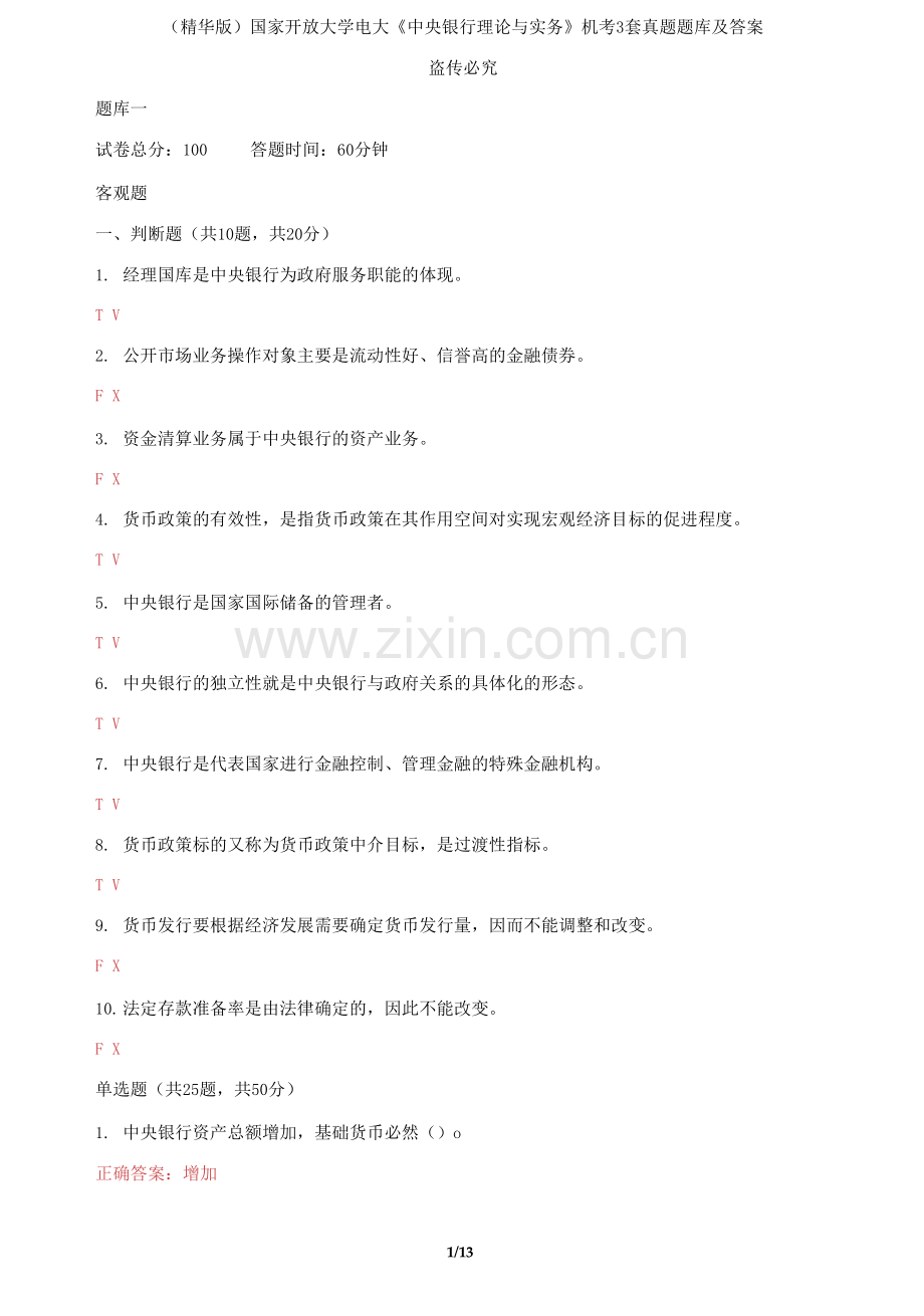 (精华版)国家开放大学电大《中央银行理论与实务》机考3套真题题库及答案
