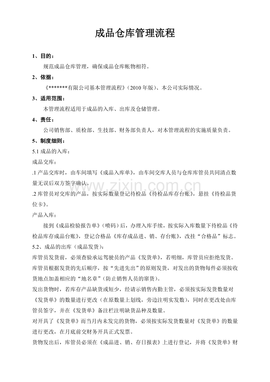 本管理流程适用于成品的入库、出库及仓储管理。