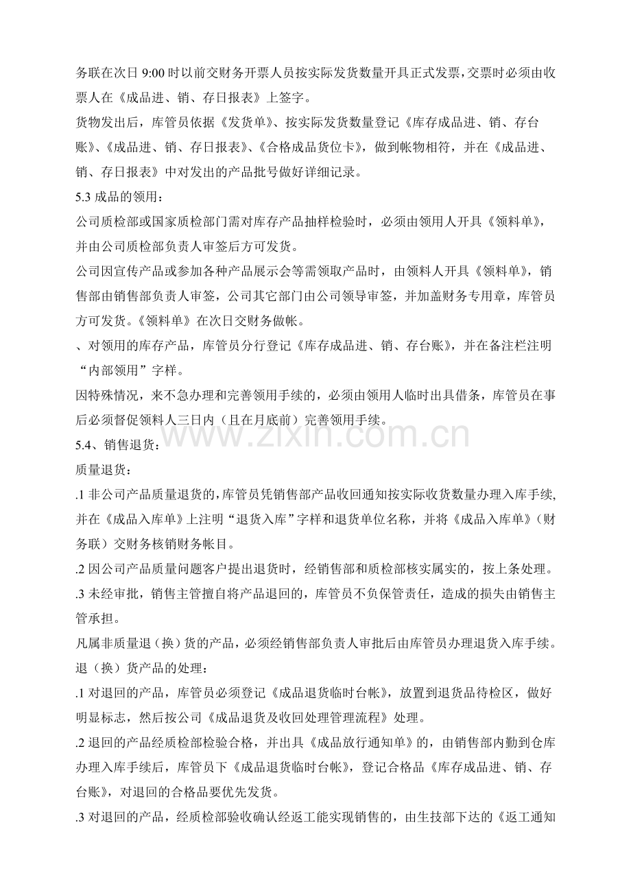 .1非公司产品质量退货的,库管员凭销售部产品收回通知按实际收货数量办理入库手续, 并在《成品入库单》上注明“退货入库”字样和退货单位名称,并将《成品入库单》(财务联)交财务核销财务帐目。