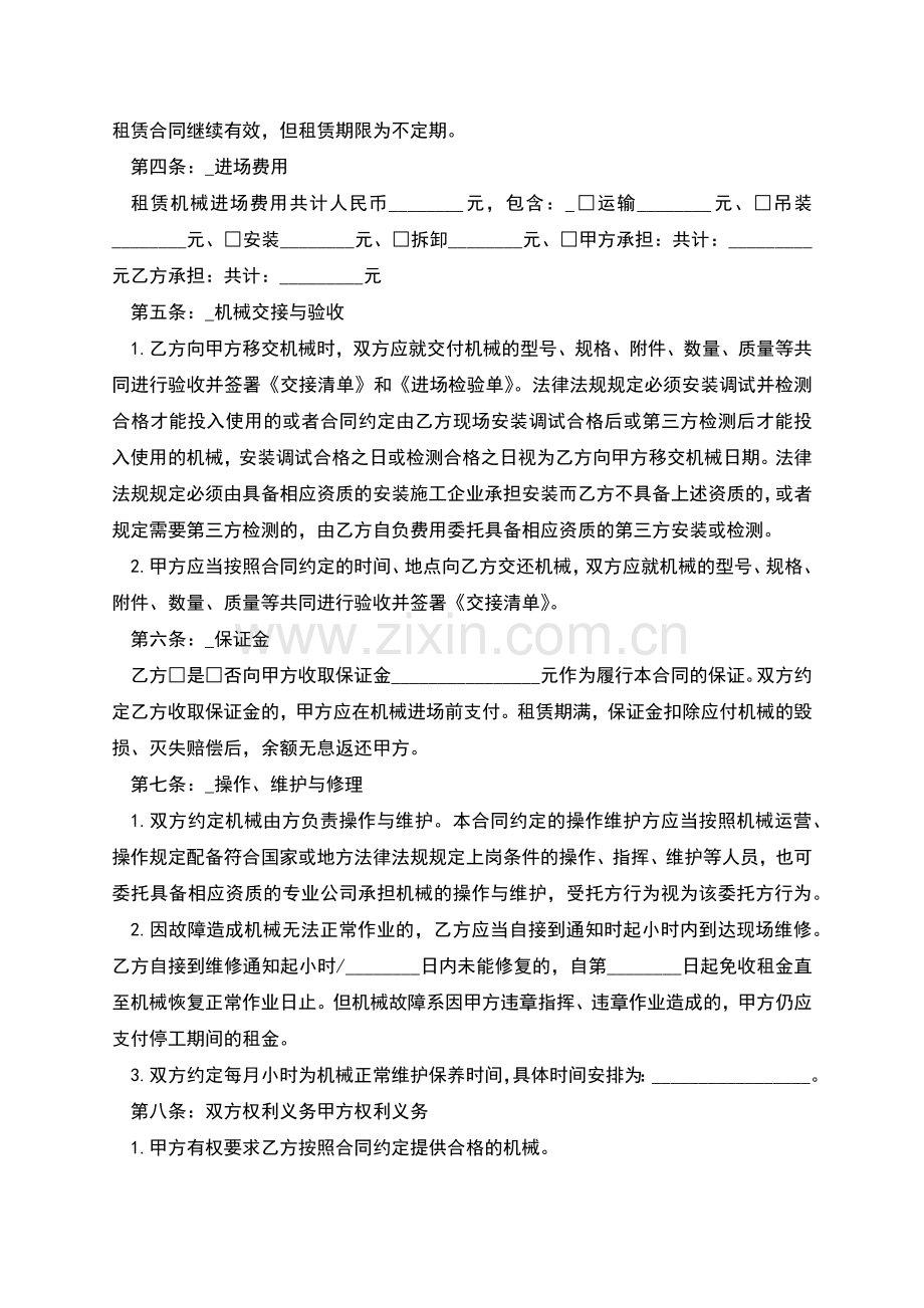 3.乙方应当按照约定的时间、地点向甲方提供约定的机械,不得提供已经淘汰或报废的机械。