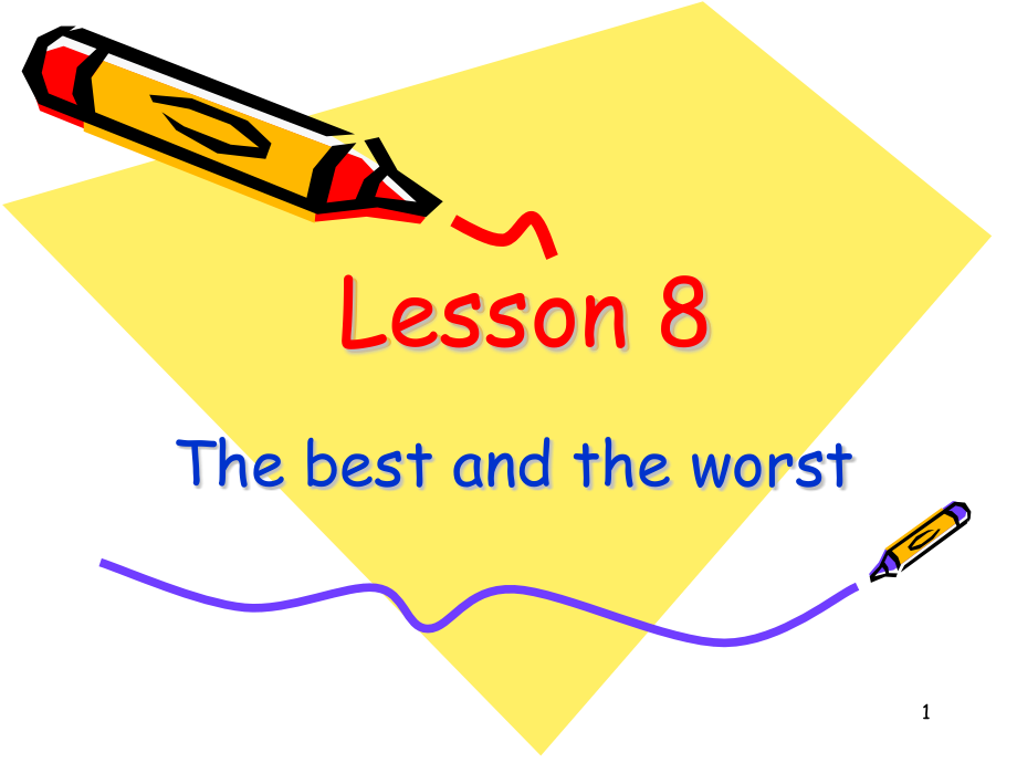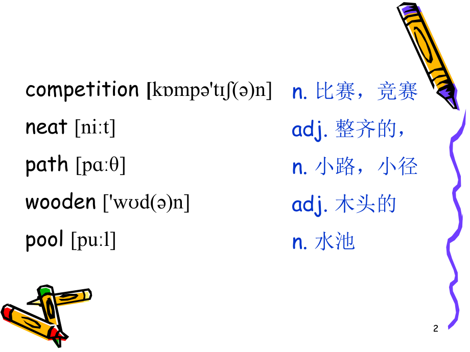 单击此处编辑母版标题样式,单击此处编辑母版文本样式,第二级,第三级,第四级,第五级,*,Lesson 8,The best and the worst,1,competition,kmpt()n,neat,nit,path,p,wooden,wd()n,pool,pul,n.比赛,竞赛,adj.整齐的,,n.小路,小径,adj.木头的,n.水池,2,competition,kmptin n.比赛,竞赛,eg.She came first in the beauty competition.,她在选美比赛中得了第一名。,competition,between,(two parties),双方之间的比赛,compete,v.kmpi:t,compete,against/with,sb 跟竞争/比赛,eg.Wecancompeteagainstanybodyandwecanwin.,我们可以与任何人竞争而且能赢得胜利。,competitor,kmpett n.,竞争者,比赛者,对手,3,neat,nit,adj.整齐的,整洁的,有序的,a neat,room,一间整洁的房间,a neat,garden,一个整齐有序的花园,a neat,road,一条整洁的小路,a neat,writing,书写工整,clean,adj.干净的,无杂质的,clean,hands,干净的双手 clean,air,清洁的空气,a clean,room,一间干净的房间,neat,adj.(口语)纯的,不掺水的,没有杂质的,a neat whisky 纯威士忌,eg.Thats neat!(,Thats great!,),太棒了!,4,path,(footpath,),p,市镇中间,住宅之间,沿路有标志的人行道,road,路,道路,公路,country road,乡村小路,by,road=by car or by bus,表示坐车这种交通方式,eg.All roads lead to Rome.,条条大路通罗马。,5,wooden,wd()n,adj.,1.木制的,a,wooden,bridge over a pool,在水池上的一个小木桥,2.举止行为僵硬而笨拙的,a wooden,smile,一个僵硬的微笑,a wooden,performance,笨拙的表演,wood,1.木,木材(不可数名词),eg.Tables are usually made of wood.,桌子通常是由木头制成的。,2.,woods,森林(不如forest大),go for a walk in the woods 在森林中散步,woody,木材的,木质的,像木头的,6,pool,pul,(指自然形成的池塘),1.水池,水坑,水塘,swimming,pool 游泳池,2.合伙投资,eg.We bought a computer,by the pool,.,我们合伙买了一台电脑。,lake,lek,湖,pond,pnd,池塘(多为人工开凿而成,用于养鸭、养鱼之用),(尤指供牲口饮水或作为花园之装饰),a,fish,pond 养鱼池,7,Joe Sanders has the most beautiful garden in our town.Nearly everybody enters for The Nicest Garden Competition each year,but Joe wins every time.Bill Friths garden is larger than Joes.Bill works harder than Joe and grows more flowers and vegetables,but Joes garden is more interesting.He has made neat paths and has built a wooden bridge over a pool.I like gardens too,but I do not like hard work.Every year I enter for the garden competition too,and I always win a little prize for the worst garden in the town!,8,Joe Sanders has the most beautiful garden in our town.,Nearly,everybody enters for The Nicest Garden Competition each year,but Joe,wins,every time.,nearly,几乎,差不多(同义词 almost),1.二者常用于,肯定句中间,eg.She fell and,nearly/almost,broke her neck.,她摔倒,几乎摔断了脖子。,He nearly/almost always arrives late.他几乎总是迟到。,区别:,2.,almost,可与否定词连用,eg.He ate,almost,nothing.他几乎什么东西都没吃。,eg.There is,almost,no room to sit.这儿几乎没有什么地方可坐。,3.,nearly,+数词,eg.The top prize is nearly 1000.一等奖几乎是1000英镑。,win,+比赛/奖品,win the match 赢得比赛,win the first prize 赢得一等奖,9,Bill Friths garden is larger than Joes.Bill works harder than Joe and grows more flowers and vegetables,but Joes garden is more interesting.He has made neat paths and has built a wooden bridge,over,a pool.,over,在垂直上方,正上方,eg.A lamp was hanging,over,the table,.,一盏灯悬挂在桌子上方。,on,表示相接触的上方,on,the table,on,the wall,above,在,上方,高于,eg.The flowers formed an archway,above,his head,.,鲜花在他头上方形成一个拱形门。,above,sea level,levl 在海平面上方,above,zero,ziru,零以上,大于零,above the,average,vrid,高于平均水平,10,I like gardens too,but I do not like hard work.Every year I,enter,for,the garden competition too,and I always win a little,prize,for the worst garden in the town!,enter for,报名参加,enter,进入,enter the room 进入房间 enter university 进入大学,entrance,entrns n.入口,take part in,参与,eg.The professor took no small part in the discussion.,那位教授根本没有参加讨论。,join in,参加,加入,eg.May I join in your conversation?,我能加入你们的谈话吗?,join in,the sports,meeting,.参加运动会,join,the army,参军,eg.Wont you,join,us in a tennis,match,?,你加入我们的网球比赛吗?,11,Grammar:,这一课的语法主要是讲了,形容词,和,副词,的,比较级,及,最高级,。,比较级和最高级的,一般变化,(,“,直去双改,”,),和,不规则变化,。,所谓,“,直去双改,”,就是形容词(单音节)的一,般变化时遵循直去双改的原则。,12,规则变化,直:,就是,直接,在词尾,加,er/est,e.g.:small,smaller,去:,就是,去,e,加,er/est,e.g.:nice,nicer,双:,就是以辅元辅结尾的闭音节单词,,双写末尾的辅音,字母,,,再加,er/est,e.g.:,big,bigger hot,hotter,改:,则是指以辅音加,y,结尾,,改,y,为,i,再加,er/est,e.g.:happy,happier,分词形容词,,一般在词前加more,most,e.g.more tired,同时形容词,多音节,的比较级规则变化则是 more+adj.,来构成。eg:more beautiful,more delicious,13,不规则变化,far,-farther-farthest,-further-furthest,old,-older-oldest,-elder-eldest,late,-later-latest,good,-better-best,well,-better-best,bad,-worse-worst,ill,-worse-worst,many,-more-most,much,-more-most,little-,-less-least,14,形容词比较级的构成,E.g.:I am taller,than,you.,You do better,than,her.,构成:,A,+be+形容词比较级+,than,+,B,A,+do+形容词比较级+,than,+,B,含义:,A 比 B,15,比较级的用法,1.,A,+be动词+形容词比较级+than+,B,表示,“,A比B更,.一些,”,e.g.This class room is larger than that one.,这间教室比那间教室要大。,He runs faster than his classmate.,他比他的同学跑的更快。,2.,“,比较级+and+比较级,”,