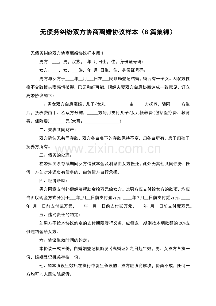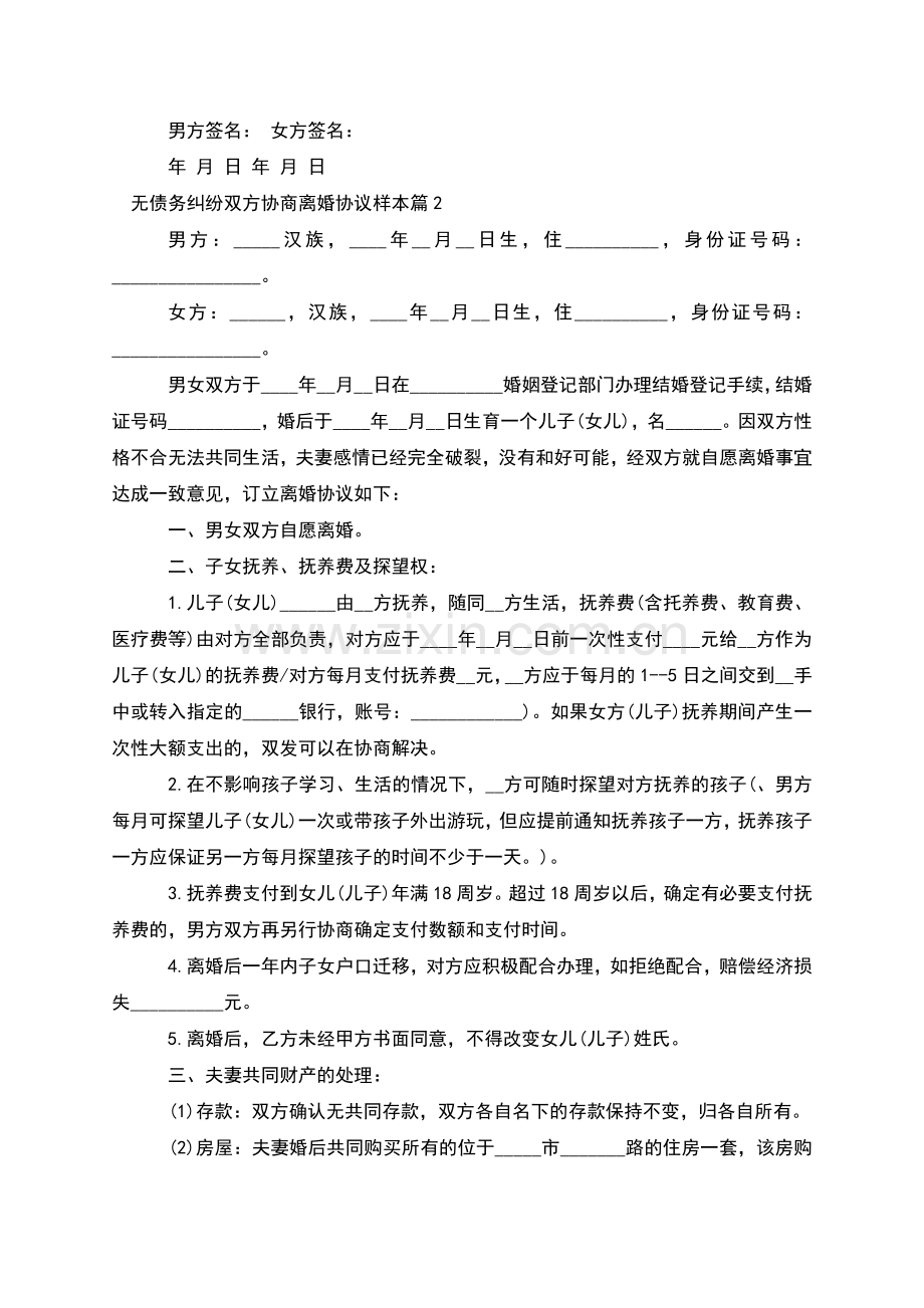 无债务纠纷双方协商离婚协议样本(8篇集锦)