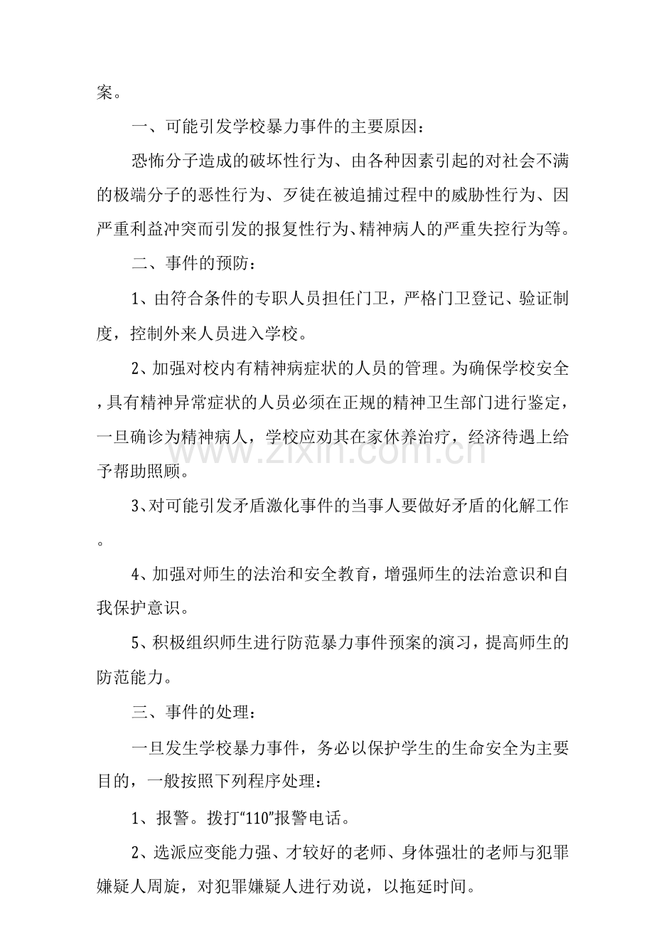 为有效预防校园暴力事件的发生,及时处置危及师生安全的各类恶性事件,有效地控制事态的扩大,切实保障广大师生生命与国家财产的安全,维护学校正常的教育教学秩序,特制定本预案。