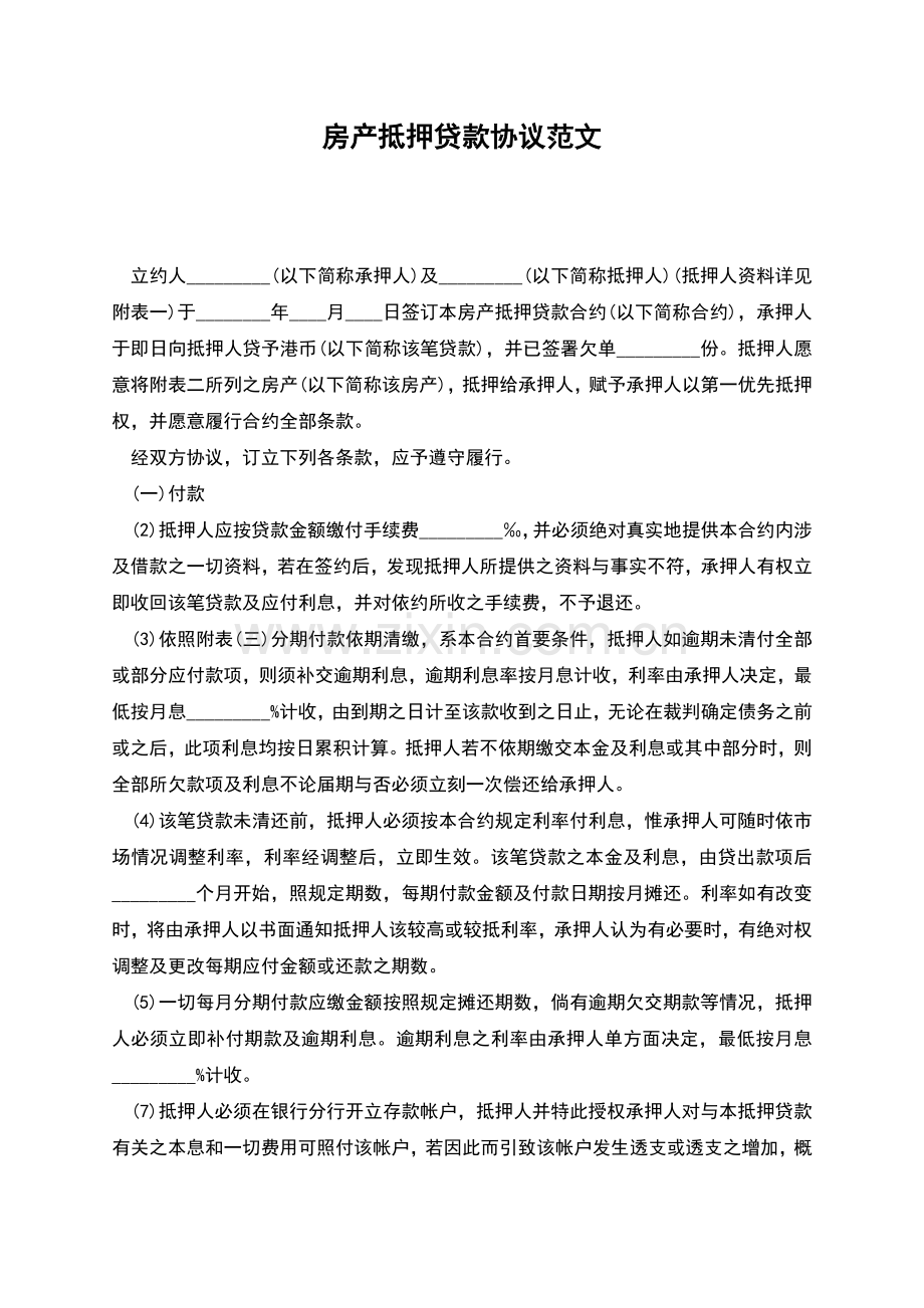 立约人_________(以下简称承押人)及_________(以下简称抵押人)(抵押人资料详见附表一)于________年____月____日签订本房产抵押贷款合约(以下简称合约),承押人于即日向抵押人贷予港币(以下简称该笔贷款),并已签署欠单_________份。抵押人愿意将附表二所列之房产(以下简称该房产),抵押给承押人,赋予承押人以第一优先抵押权,并愿意履行合约全部条款。