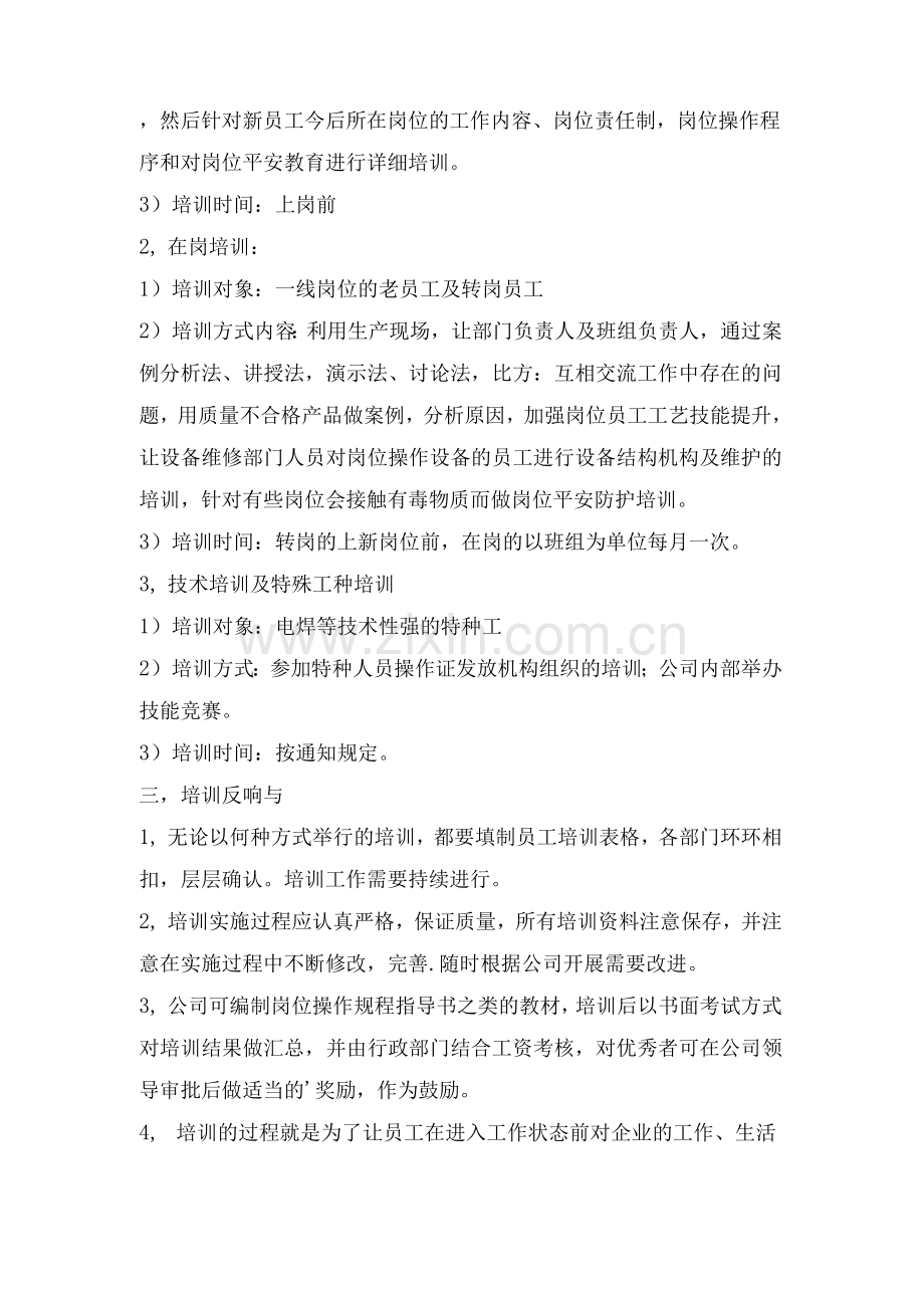 2)培训方式内容:利用生产现场,让部门负责人及班组负责人,通过案例分析法、讲授法,演示法、讨论法,比方:互相交流工作中存在的问题,用质量不合格产品做案例,分析原因,加强岗位员工工艺技能提升,让设备维修部门人员对岗位操作设备的员工进行设备结构机构及维护的培训,针对有些岗位会接触有毒物质而做岗位平安防护培训。