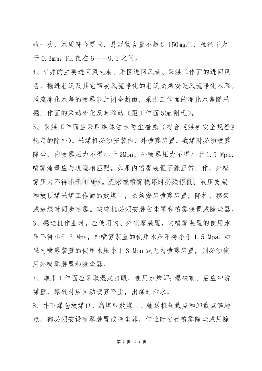 2、矿井必须建立完善的防尘供水系统。没有防尘供水管路的采掘工作面不得生产。主要运输巷、带式输送机斜井与平巷、上山与下山、采区运输巷与回风巷、采煤工作面运输巷与回风巷、掘进巷道、煤仓放煤口、溜煤眼放煤口、卸载点及地面洗选、煤炭储装运系统等地点都必须敷设防尘供水管路。为矿井或两个及以上采区服务的防尘系统要安设内径不小于150mm的管路,为一个采区服务的防尘系统安设内径不小于100mm的管路,只进行冲洗的防尘系统安设内径50mm的管路,采、掘、开巷道安设内径50mm――100mm的管路。防尘管路系统中应安设水质过滤器,支管和阀门要齐全,胶带运输巷道内的管路每50m设一个支管和阀门,其它巷道内的管路每100m设一个支管和阀门。各矿井每半年填制一次防尘管路系统图,并报集团公司生产技术处备案。