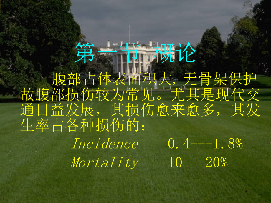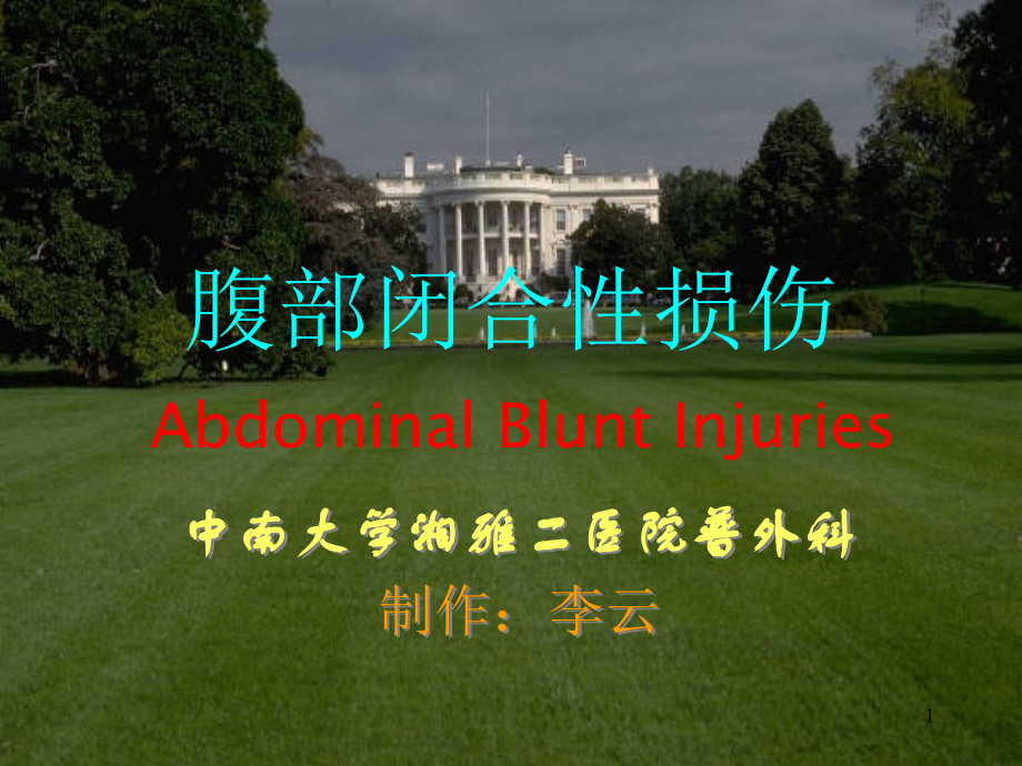 单击此处编辑母版标题样式,单击此处编辑母版文本样式,第二级,第三级,第四级,第五级,*,腹部闭合性损伤,Abdominal Blunt Injuries,中南大学湘雅二医院普外科,制作:李云,1,第一节 概论,腹部占体表面积大,,,无骨架保护故腹部损伤较为常见。尤其是现代交通日益发展,其损伤愈来愈多,其发生率占各种损伤的:,Incidence,0.4-1.8%,Mortality,10-20%,2,本章的重点及难点,重点:(,1,)掌握其急救、早期诊断方法,和治疗原则。,(,2,)熟悉肝、脾和肠破裂的鉴别,诊断。,难点:如何判定有无内脏损伤。,3,腹部损伤的分类,(,1,)开放性腹部损伤,(Opened),一般为锐器所致,有明显的伤道,伤性清楚,诊断容易明确,处理容易及时,治疗效果及予后较好。,(,2,)闭合性腹部损伤,(Closed),一般为钝器所致,体表无伤痕,往往有内脏损伤,容易漏诊,因此更具有重要的临床意义。,4,一、病因(,Etiology),1,、暴力(直接、间接),坠落、碰撞、冲击、挤压、拳打脚踢,等。,2,、常见内脏损伤顺序依次是:脾,肠,肝。胰、,12,指肠损伤较少。,3,、损伤的严重程度与受伤机制和脏器的,解剖、病理、功能状态有关。,5,受伤机制,暴力的强度:暴力的大小、速度、方向,暴力的作用部位、硬度,6,脏器的特点,生理因素:,1,、肝、脾质地脆弱,管道丰,富、容易破裂出血。,2,、肠管固定处,3,、脊柱前方脏器,病理因素:肝、脾原有病理情况,功能状态:胃、膀胱充盈时,7,二、临床表现(,Manifestation),单纯腹壁损伤:症状、体征轻,压痛局限,范围不会扩大,没有胃肠道症状。,腹内脏器挫伤:症状、体征轻,,B,超诊断,腹内实质性脏器损伤:,(,1,),内出血为主,可出现失血性休克(,hemorrhagic shock,),(,2,),血性腹膜炎 压痛、,ST,征都较轻。,8,腹内空腔脏器损伤:,(,1,)弥漫性腹膜炎,(peritonitis),为主,,(,2,)消化道症状,(,3,)全身中毒症状 可出现感染性休克。,腹内混合性脏器损伤:内出血加腹,膜炎,9,三、诊断(,Diagnosis),1,、有无内脏损伤(病情危重诊断和抢救应,同时进行)可能因病情的早期、合并,其他伤情,为了防止漏,必须注意:,(,1,)重视全身情况,T,、,P,、,R,、,BP,及神智,(,2,)详细了解受伤史 尤其是致伤条件,(,3,)全面而重点的体格检查 肝浊、肠鸣,(,4,)必要的化验 血、尿常规、淀粉酶,10,下列情况之一考虑脏器损伤:,1,、早期出现休克(失血性)。,2,、持续性的腹剧痛,伴有消化道症状。,3,、有明显的腹膜刺激征。,4,、有气腹表现者。,5,、有移动性浊音。,6,、便血、呕血、或血尿。,7,、直肠指诊前壁压痛、波动感、指带血。,11,2,、,什么样的脏器损伤,哪一类的脏器损伤:,实质性的,-,休克为主,空腔性的,-,腹膜炎为主,消化道症状、气腹,-,空腔性,排尿困难、血尿,-,泌尿系,下位肋骨骨拆、肩痛,-,肝、脾破裂,12,3,、是否为多发性损伤(应特别注意),包括,:,(,1,)一脏器多处破裂,(,2,)腹内一个以上脏器受损,(,3,)腹内损伤合并腹外损伤,(,4,)腹外损伤累及腹内脏器,13,4,、遇到诊断困难采取的措施,(,1,)进行其他的辅助检查(情况允许),A,、诊断性腹穿或腹腔灌洗术,90%+,比较理想,简单,不搬动,没有并,发症。,B,、,X,线检查:,KUB-,膈下游离气体胸,片,肋骨骨拆选择性血管造影、,CT,C,、,B,超检查 既方便、又可靠,14,(,2,)进行严密的观查,内容:,A,、每,15,30,分钟测定,P,、,R,、,BP,B,、每,30,分钟检查腹部体征(,ST,),C,、每,30,60,分钟测,HB,、,RBC,等,D,、必要时重复腹穿,15,严密观察时应做到,三不,:,(,1,)不随意搬动,以免加重病情,(,2,)不注射止痛剂以免掩盖伤情,(,3,)不给饮食,以免加重污染,三要,:,(,1,)积极补液,防治休克,(,2,)注射抗生素,防治感染,(,3,)胃肠减压,16,(,3,)剖腹探查,(ExploratoryLaparotomy),:,通过上述方法未能确诊,又不能排除脏器损伤,观察时病情恶化,腹痛加重,腹胀加重,全身情况变差,且积极治疗不见好转,应立即剖腹探查。,既使探查阴性也无可非议。,17,四处理原则,Treatment Principles,外伤的总原则:先救命,后治伤。先处理对生命威胁最大的损伤。因此抢救顺序为:胸(大血管),腹,颅,骨,腹内脏器损伤:实质性脏器 在积极抗休克的同时手术治疗;空腔性脏器 先抗休克后手术治疗。,手术中:先止血,后探查;先污染重;后污染轻;全面探查,注意复合伤。,18,腹部损伤临床思维路线图,腹部损伤(判定,1,:有无内脏损伤),无:对症处理,疑:严密观察,相应处理,必要检查,有,:,(判定,2,:哪一类脏器损伤),实质性 空腔性,积极抗休克同时手术先抗休克后手术,19,第二节各论,1,、脾破裂,2,、肝破裂,3,、小肠破裂,4,、大肠破裂,20,一、脾破裂,Rupture of the spleen,发病率占各种腹损伤的,40,50%,,最易,损伤,病理脾更容易破裂。,分三种类型(,1,)被膜下破裂 被膜未破,(,2,)中央型破裂 形成血肿,(,3,)真性脾破裂 占,85%,临床表现及诊断:典型失血性休克表现,21,22,特别要注意的情况及治疗:,被膜下血肿,在某些微弱的外力下,突然转变为真性脾破裂,导致治疗中措手不及的局面,常发生在外伤后,1,2,周,应当给予高度警惕。称之为延迟型脾破裂。,治疗:一经诊断,立即手术。通常行脾切除术(,Splenctomy),。儿童也采取脾修补术及脾移植。,近几年来也有非手术保脾疗法。,23,二、肝破裂,Injuries of the liver,发病率占各种腹部损伤的,15,20%,,右肝损伤比左肝多,肝硬化时,更易损伤。,病理类型及临床表现与脾破裂极为相似。,但因肝破裂后可能有胆汁溢入腹腔,因此腹痛和腹膜刺激征比脾破裂更为明显。,可能有周期性胆道出血,因为破裂的血管与胆管沟通。,中央型破裂