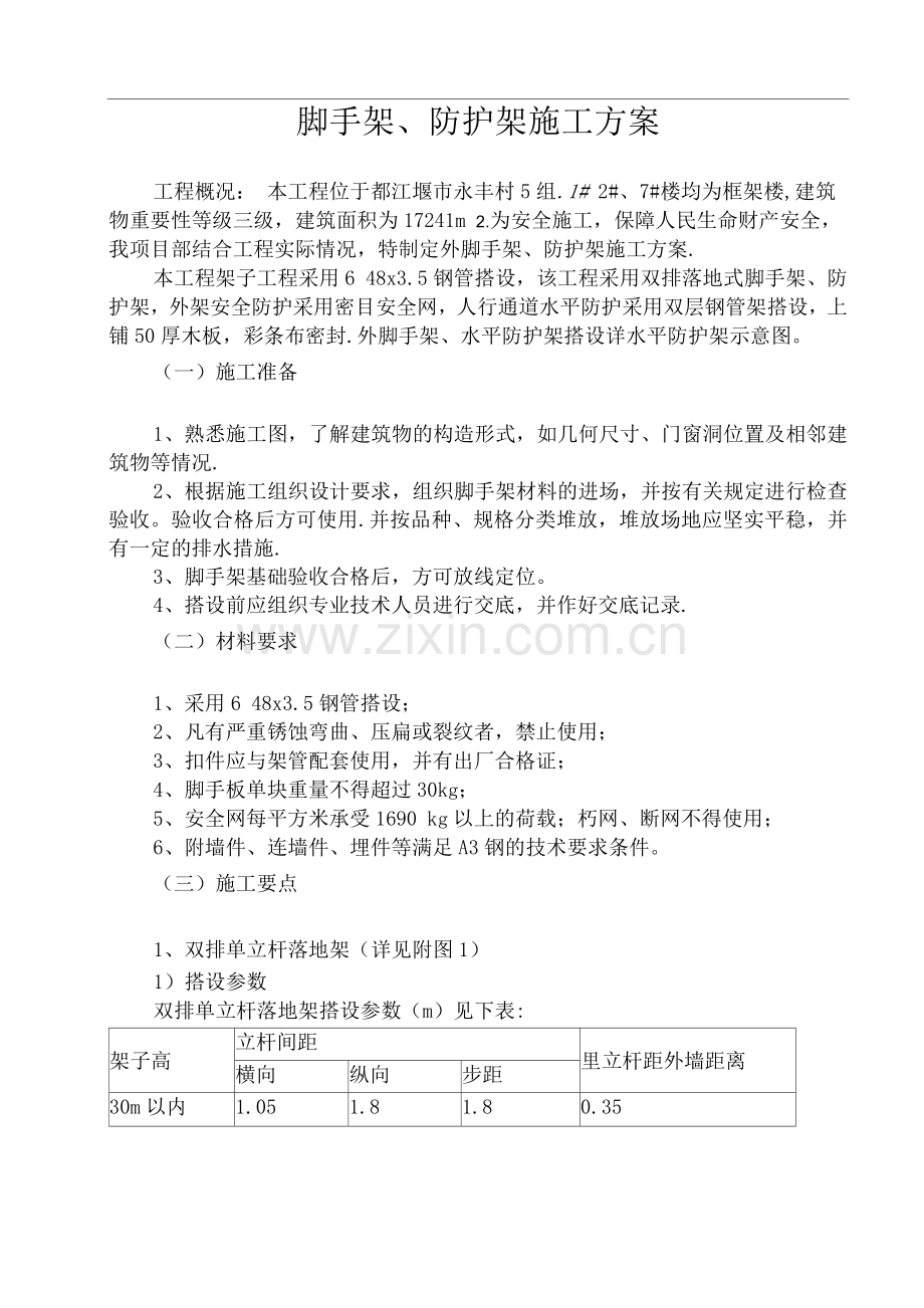 工程概况: 本工程位于都江堰市永丰村5组.1# 2#、7#楼均为框架楼,建筑物重要性等级三级,建筑面积为17241m 2.为安全施工,保障人民生命财产安全,我项目部结合工程实际情况,特制定外脚手架、防护架施工方案.