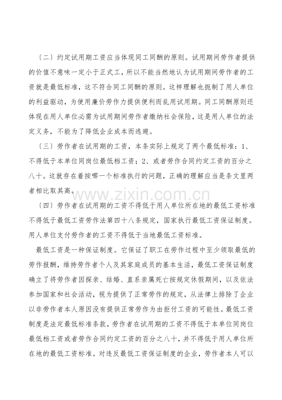 〔二〕约定试用期工资应当体现同工同酬的原则。试用期间劳作者提供的价值不意味一定小于正式工,所以不能当然地认为试用期间劳作者的工资就是最低标准,这不符合同工同酬的原则。这样理解也扼制了用人单位的利益驱动,为使用廉价劳作力提供便利而乱用试用期。同工同酬原则还体现在用人单位必需为试用期间劳作者缴纳社会保险,这是用人单位的法定义务,不能为了降低企业成本而逃避。