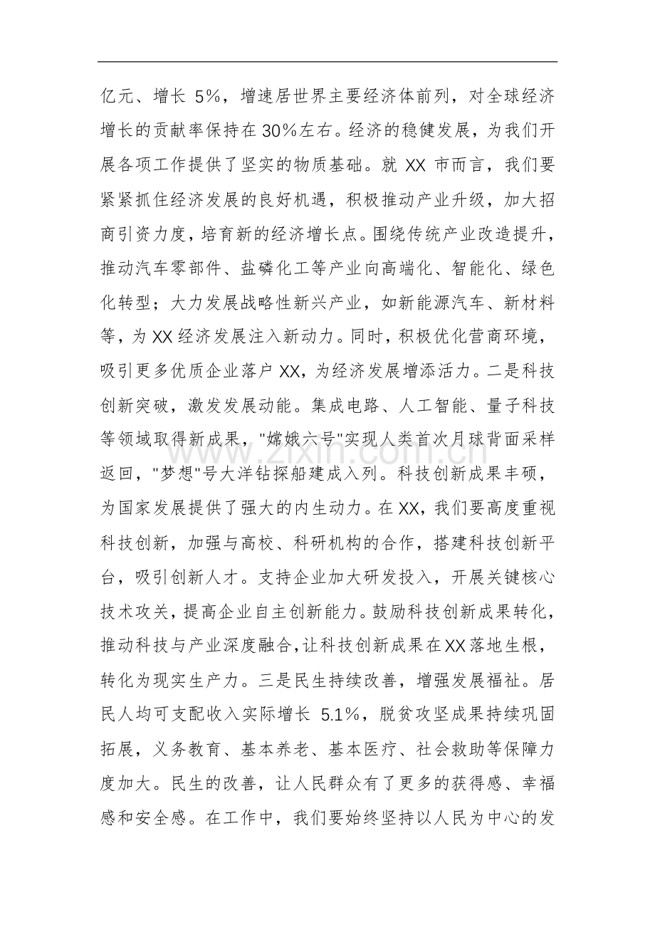 过去一年,在以习近平同志为核心的党中央坚强领导下,我国在经济、社会、民生等领域取得了令人瞩目的成就。这些成就的取得,充分彰显了中国特色社会主义制度的强大生命力和巨大优越性,也让我们对未来的发展充满信心。一是经济稳健增长,筑牢发展根基。国内生产总值达到134.9万亿元、增长5%,增速居世界主要经济体前列,对全球经济增长的贡献率保持在30%左右。经济的稳健发展,为我们开展各项工作提供了坚实的物质基础。就XX市而言,我们要紧紧抓住经济发展的良好机遇,积极推动产业升级,加大招商引资力度,培育新的经济增长点。围绕传统产业改造提升,推动汽车零部件、盐磷化工等产业向高端化、智能化、绿色化转型;大力发展战略性新兴产业,如新能源汽车、新材料等,为XX经济发展注入新动力。同时,积极优化营商环境,吸引更多优质企业落户XX,为经济发展增添活力。二是科技创新突破,激发发展动能。集成电路、人工智能、量子科技等领域取得新成果,"嫦娥六号"实现人类首次月球背面采样返回,"梦想"号大洋钻探船建成入列。科技创新成果丰硕,为国家发展提供了强大的内生动力。在XX,我们要高度重视科技创新,加强与高校、科研机构的合作,搭建科技创新平台,吸引创新人才。支持企业加大研发投入,开展关键核心技术攻关,提高企业自主创新能力。鼓励科技创新成果转化,推动科技与产业深度融合,让科技创新成果在XX落地生根,转化为现实生产力。三是民生持续改善,增强发展福祉。居民人均可支配收入实际增长5.1%,脱贫攻坚成果持续巩固拓展,义务教育、基本养老、基本医疗、社会救助等保障力度加大。民生的改善,让人民群众有了更多的获得感、幸福感和安全感。在工作中,我们要始终坚持以人民为中心的发展思想,关注民生需求,着力解决人民群众关心的热点难点问题。加大教育投入,改善教育基础设施,提高教育质量,促进教育公平;加强医疗卫生体系建设,提升基层医疗服务水平,让群众在家门口就能享受到优质的医疗服务;完善社会保障体系,加大对困难群体的帮扶力度,兜牢民生底线。