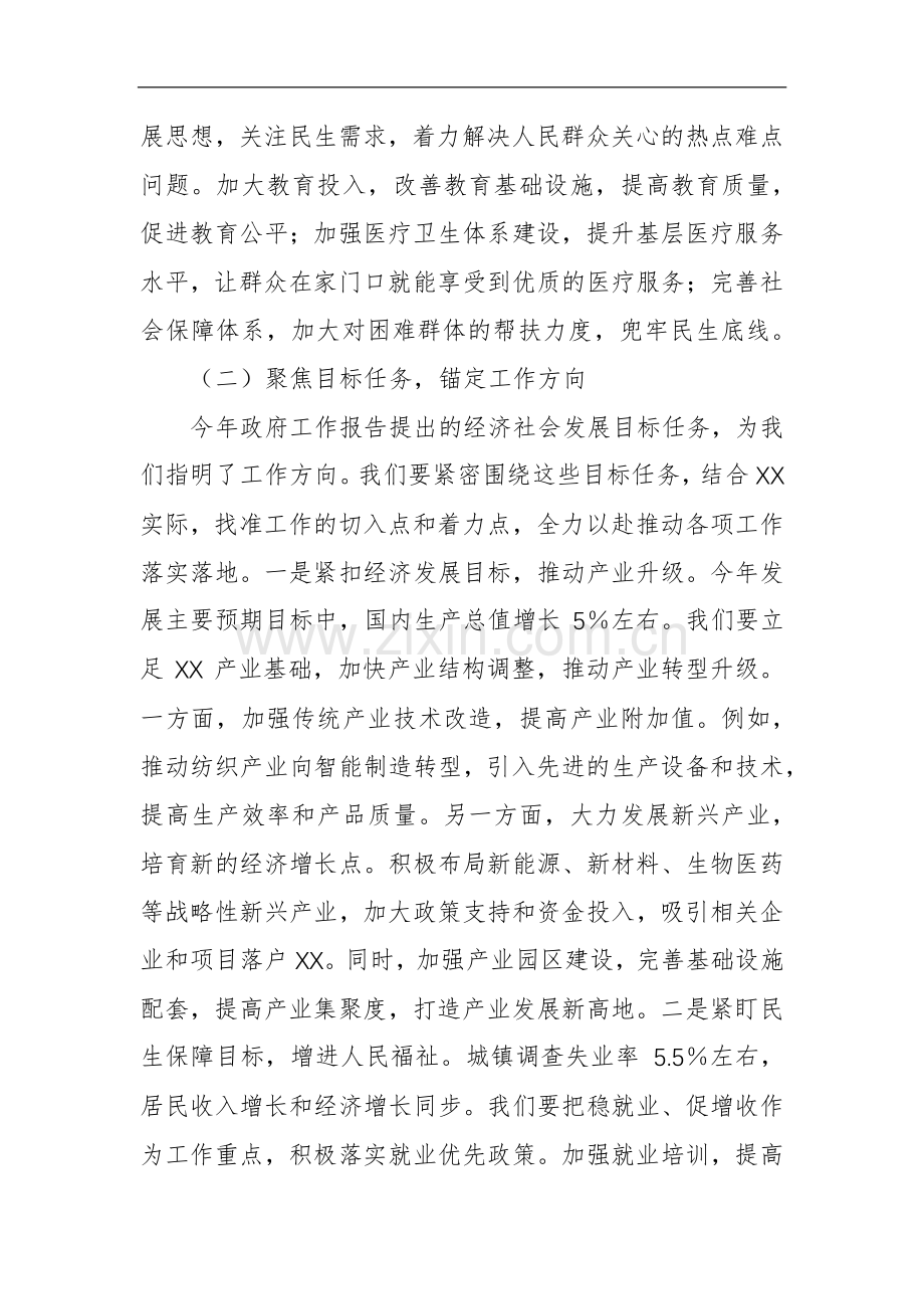 今年政府工作报告提出的经济社会发展目标任务,为我们指明了工作方向。我们要紧密围绕这些目标任务,结合XX实际,找准工作的切入点和着力点,全力以赴推动各项工作落实落地。一是紧扣经济发展目标,推动产业升级。今年发展主要预期目标中,国内生产总值增长5%左右。我们要立足XX产业基础,加快产业结构调整,推动产业转型升级。一方面,加强传统产业技术改造,提高产业附加值。例如,推动纺织产业向智能制造转型,引入先进的生产设备和技术,提高生产效率和产品质量。另一方面,大力发展新兴产业,培育新的经济增长点。积极布局新能源、新材料、生物医药等战略性新兴产业,加大政策支持和资金投入,吸引相关企业和项目落户XX。同时,加强产业园区建设,完善基础设施配套,提高产业集聚度,打造产业发展新高地。二是紧盯民生保障目标,增进人民福祉。城镇调查失业率5.5%左右,居民收入增长和经济增长同步。我们要把稳就业、促增收作为工作重点,积极落实就业优先政策。加强就业培训,提高劳动者就业技能,为企业输送高素质人才。鼓励创业带动就业,加大对创业的扶持力度,提供创业担保贷款、创业培训等服务。关注困难群体就业,开展就业援助行动,托底安置就业困难人员。同时,推动居民收入增长,通过提高工资水平、完善收入分配制度等措施,让人民群众共享经济发展成果。三是对标生态环保目标,打造绿色家园。单位国内生产总值能耗降低3%左右,生态环境质量持续改善。我们要牢固树立绿色发展理念,加强生态环境保护。加大环境污染治理力度,加强大气、水、土壤污染防治,改善生态环境质量。推进节能减排,加强重点企业监管,推动企业实施清洁生产。加强生态修复,推进山水林田湖草沙一体化保护和系统治理。同时,积极发展绿色产业,推广绿色建筑、新能源汽车等,推动经济社会发展全面绿色转型。