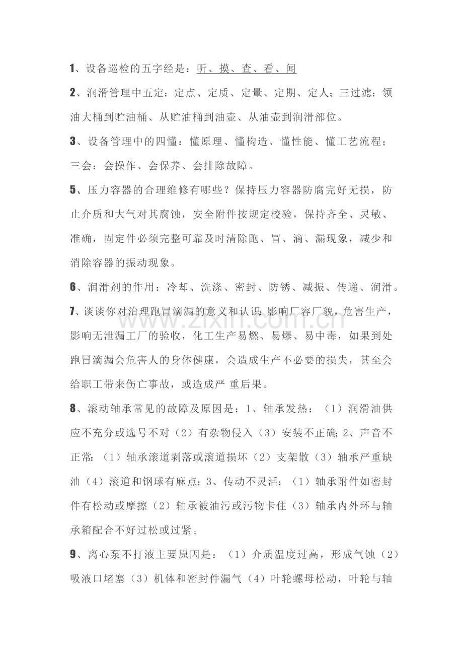 7、谈谈你对治理跑冒滴漏的意义和认识:影响厂容厂貌,危害生产,影响无泄漏工厂的验收,化工生产易燃、易爆、易中毒,如果到处跑冒滴漏会危害人的身体健康,会造成生产不必要的损失,甚至会给职工带来伤亡事故,或造成严 重后果。