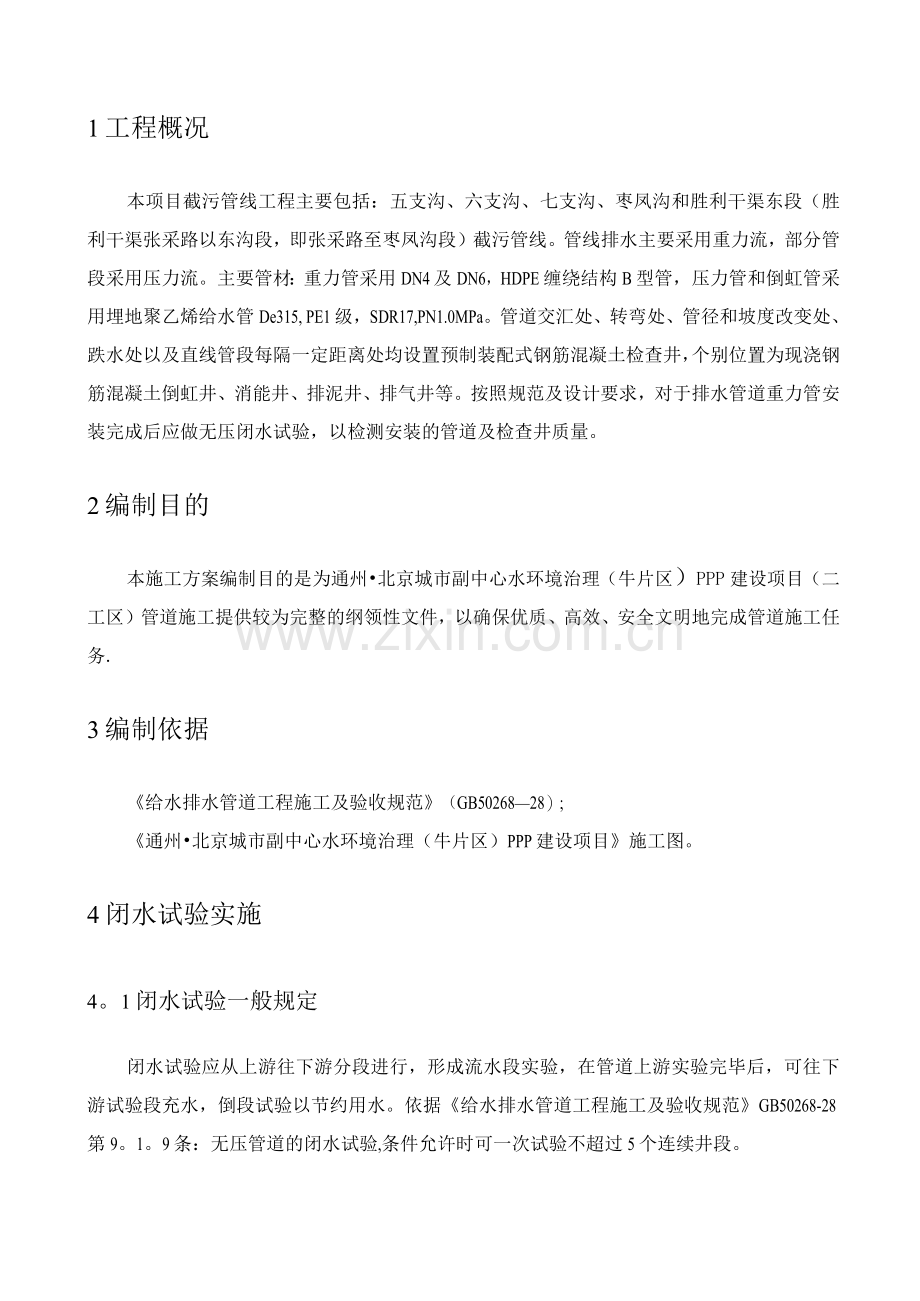 本项目截污管线工程主要包括:五支沟、六支沟、七支沟、枣凤沟和胜利干渠东段(胜利干渠张采路以东沟段,即张采路至枣凤沟段)截污管线。管线排水主要采用重力流,部分管段采用压力流。主要管材:重力管采用DN4及DN6,HDPE缠绕结构B型管,压力管和倒虹管采用埋地聚乙烯给水管De315, PE1级,SDR17,PN1.0MPa。管道交汇处、转弯处、管径和坡度改变处、跌水处以及直线管段每隔一定距离处均设置预制装配式钢筋混凝土检查井,个别位置为现浇钢筋混凝土倒虹井、消能井、排泥井、排气井等。按照规范及设计要求,对于排水管道重力管安装完成后应做无压闭水试验,以检测安装的管道及检查井质量。