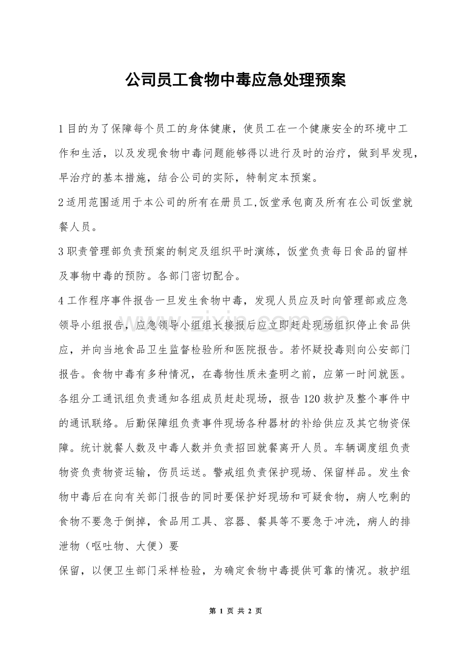 公司员工食物中毒应急处理预案
