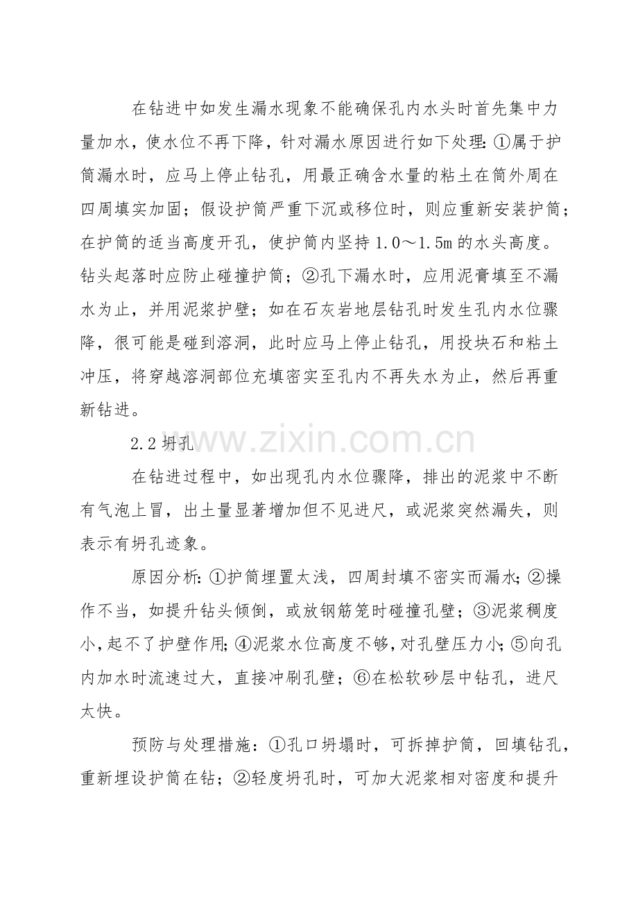 预防与处理措施:①孔口坍塌时,可拆掉护筒,回填钻孔,重新埋设护筒在钻;②轻度坍孔时,可加大泥浆相对密度和提升水位;③严重坍孔时,用粘土泥膏投入,待孔壁稳定后采纳低速钻进;④水位变化过大时,应采用升高护筒,增加水头或用虹吸管等措施确保水头相对稳定;⑤提升钻头及下钢筋笼时坚持垂直,尽量不要碰撞孔壁;⑥在松软砂层钻进时,应控制进尺速度,且用较好的泥浆护壁。
