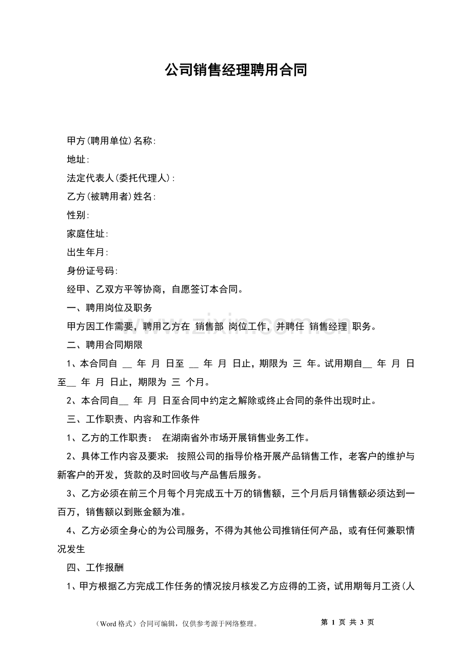 甲方因工作需要,聘用乙方在 销售部 岗位工作,并聘任 销售经理 职务。