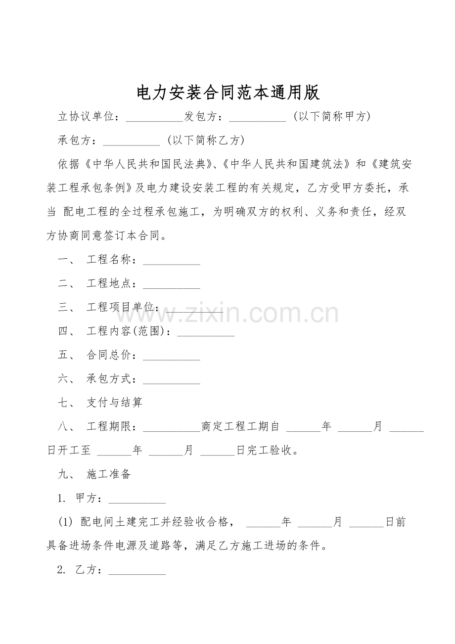 电力安装合同范本通用版