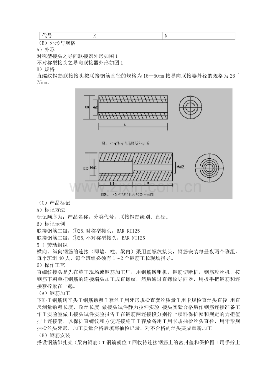 直螺纹钢筋接头是先将钢筋镦粗,加工成钢筋直螺纹,通过螺纹导向器把钢筋旋合连成一个整体的一种新型钢筋连接工艺。此项工艺是适用于目前城市高层建筑的日益发展,对建筑结构的整体性、安全性得到了充分的保证。避免了钢筋常规型锥螺纹,冷挤压等连接方式的质量通病。高效率的施工,简单的技术管理,是一项成熟且适合于高层建筑的施工工艺。