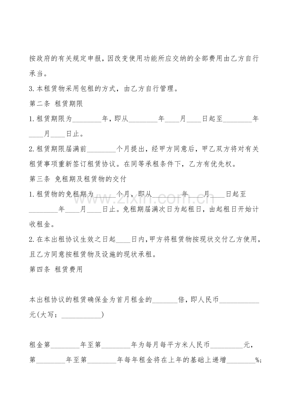 2.本租赁物的功能为_____________,包租给乙方使用。如乙方必需转变使用功能,须经甲方书面同意,因转变功能所必需办理的全部手续由乙方按政府的有关规定申报,因改变使用功能所应交纳的全部费用由乙方自行承当。