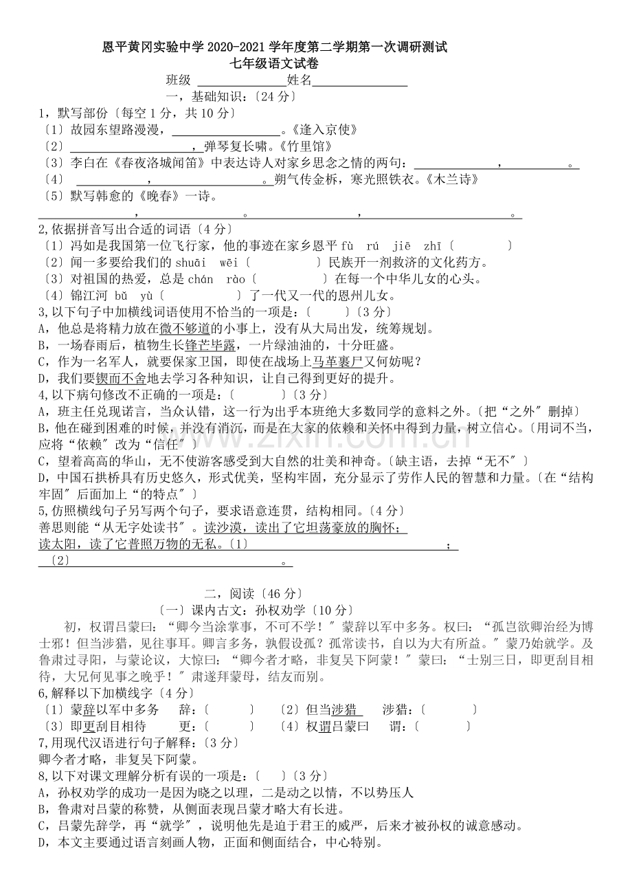 恩平黄冈实验中学2020-2021学年度第二学期第一次调研测试