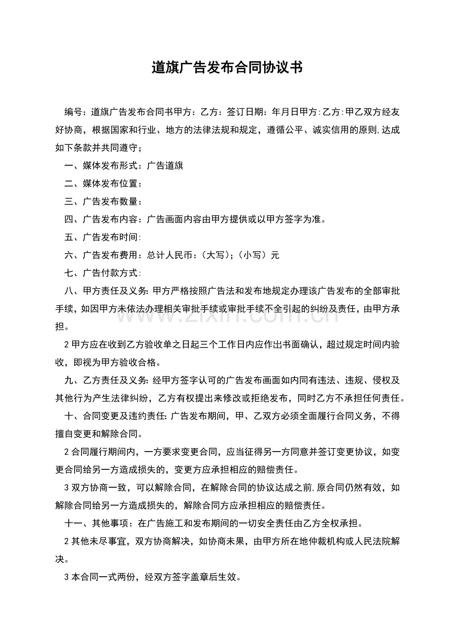 编号:道旗广告发布合同书甲方:乙方:签订日期:年月日甲方:乙方:甲乙双方经友好协商,根据国家和行业、地方的法律法规和规定,遵循公平、诚实信用的原则,达成如下条款并共同遵守;