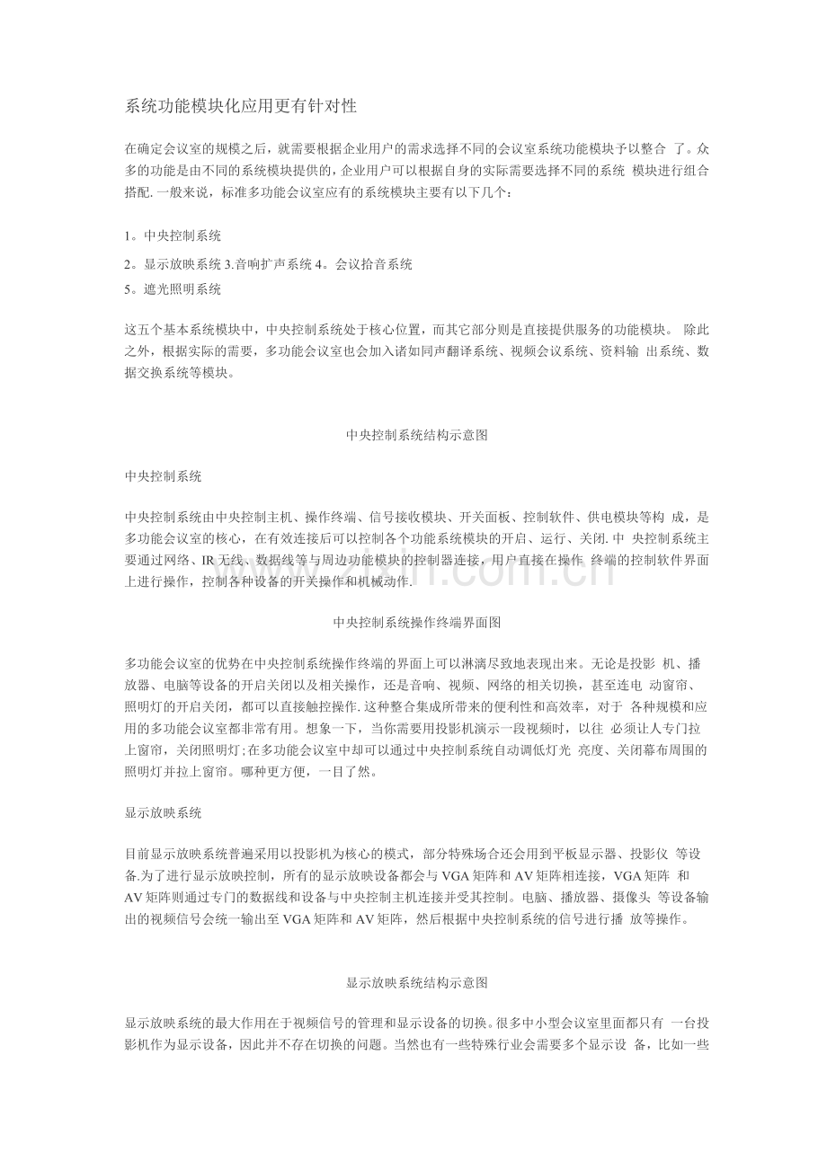 这五个基本系统模块中,中央控制系统处于核心位置,而其它部分则是直接提供服务的功能模块。 除此之外,根据实际的需要,多功能会议室也会加入诸如同声翻译系统、视频会议系统、资料输 出系统、数据交换系统等模块。