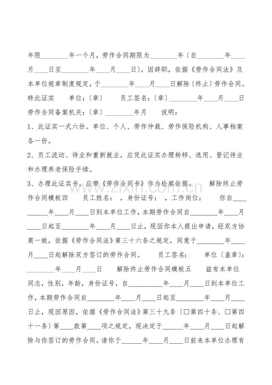 3、办理此证实书,应带《劳作合同书》作为检察依据。 解除终止劳作合同模板四 员工姓名: ,身份证号: ,工作岗位: 你自_____年__月__日到本单位工作,本期劳作合同自____年__月__日起至____年__月__日止,现因你本人提出申请,经双方协商一致,依据《劳作合同法》第三十六条之规定,同意于____年__月__日起解除双方签订的劳作合同。 员工签名: 单位〔盖章〕:________年____月____日 解除终止劳作合同模板五 兹有本单位同志,性别,年龄,身份证号,自_____年__月__日到本单位工作,本期劳作合同自____年__月__日起至____年__月__日止,现因原因,依据《劳作合同法》第三十九条〔□第四十条、□第四十一条〕第__款第__项之规定,现决定于___年__月__日起解除与你签订的劳作合同。请你于___年__月__日前来本单位办理有关手续。 如对本决定有异议,可在收到本决定书之日起____日内向某某劳作争议仲裁委员会申请仲裁。 单位〔盖章〕:________年____月____日