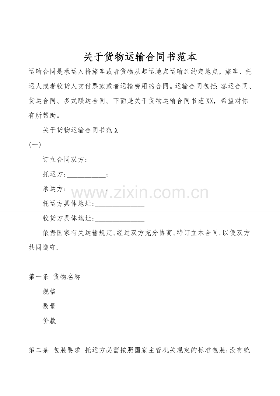运输合同是承运人将旅客或者货物从起运地点运输到约定地点,旅客、托运人或者收货人支付票款或者运输费用的合同。运输合同包括:客运合同、货运合同、多式联运合同。下面是关于货物运输合同书范XX,希望对你有所帮助。