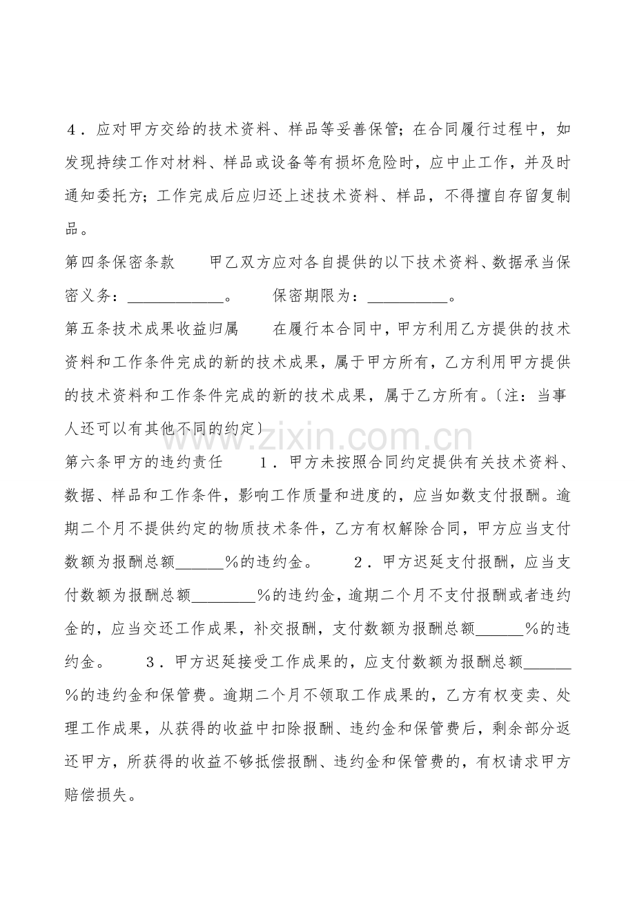 第三条乙方的主要义务 1.在____年__月__日前完成技术服务工作; 2.依照以下技术经济指标完成技术服务工作____。 3.发现甲方提供的技术资料、数据、样品、材料或工作条件不符合合同约按时,应在合同生效后___天内通知委托方改善或者改换; 4.应对甲方交给的技术资料、样品等妥善保管;在合同履行过程中,如发现持续工作对材料、样品或设备等有损坏危险时,应中止工作,并及时通知委托方;工作完成后应归还上述技术资料、样品,不得擅自存留复制品。