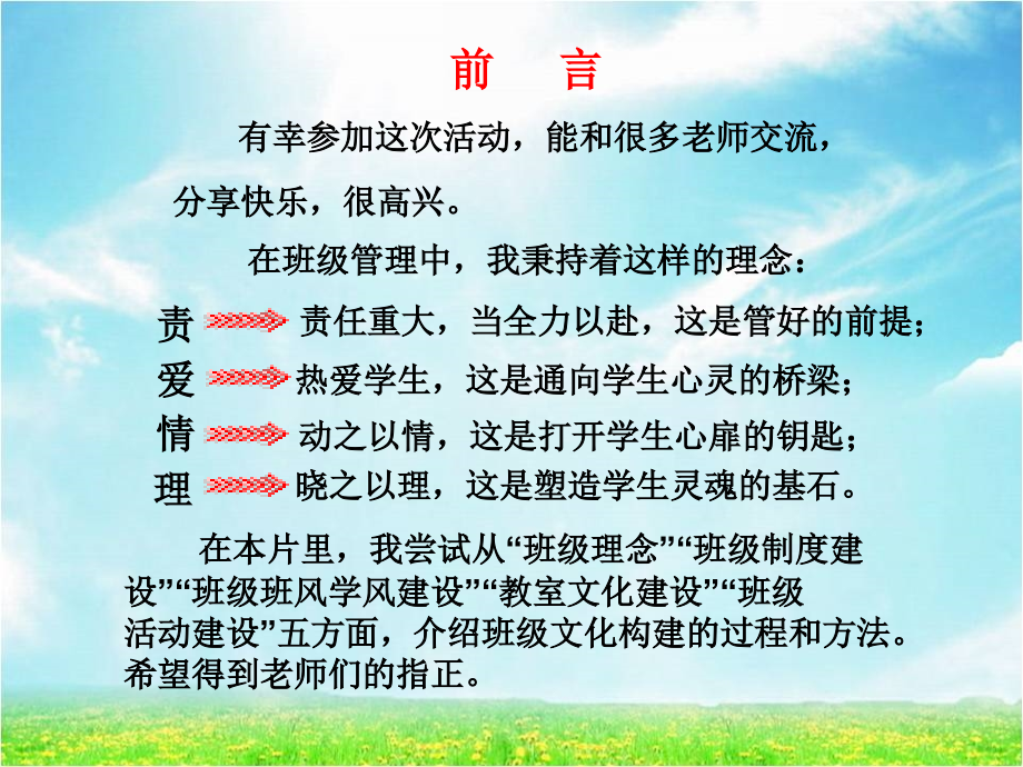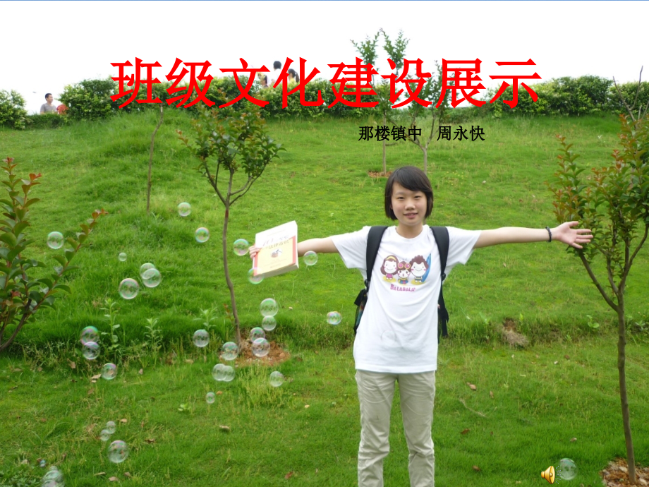 单击此处编辑母版标题样式,单击此处编辑母版文本样式,第二级,第三级,第四级,第五级,#,班级文化建设展示,那楼镇中 周永快,前 言,有幸参加这次活动,能和很多老师交流,分享快乐,很高兴。,在班级管理中,我秉持着这样的理念:,在本片里,我尝试从“班级理念”“班级制度建设”“班级班风学风建设”“教室文化建设”“班级活动建设”五方面,介绍班级文化构建的过程和方法。希望得到老师们的指正。,责,责任重大,当全力以赴,这是管好的前提;,爱,情,理,热爱学生,这是通向学生心灵的桥梁;,动之以情,这是打开学生心扉的钥匙;,晓之以理,这是塑造学生灵魂的基石。,目录,第一篇、快乐逐梦班级,第二篇、班级理念,第五篇、教室、寝室文化建设,第三篇、班级制度建设,第四篇、班级班风学风建设及班级特色,第六篇、班级活动建设,第一篇 快乐逐梦班级,12,(,3,)班是一个充满青春朝气的班集体,是一个产生快乐的大熔炉,是一个孕育希望的港湾。,这里展现的是美好瞬间的倩影,这里奏响的是纯真友谊的旋律,这里把我们的心灵点缀得如同阳光下盛开的繁花。,在这里,每位同学都尽自己最大的努力去绘制我们美好蓝图,时光荡涤了我们曾经的不足,也激励我们奋勇前进。在我们美好的时光里,记载了辉煌、感动与梦想,也镌刻了失败、挫折与希望,我们就如同一朵盛开的花,每一个花瓣就是我们每一个人。,我们,54,个天使像,54,颗星辰,照亮了七年级,3,班、温暖了七年级,3,班,使我们的班集体更加辉煌灿烂。,54,个天使拥抱着,54,个梦想,带着希望与梦想,我们一起扬帆远航!,第二篇 班级理念,新学期,新班级,伊始之初,让学生们为班级设计一个班徽,他们踊跃投稿。最后,评选出“由雄鹰搏击长空和帆船乘风破浪组合”的班徽。,(一)班级精神,讨论会上,大家七嘴八舌,从班徽中提炼出其中象征的精神:,雄鹰,勇敢,拼搏,进取,于是便形成了班级精神:,勇敢,拼搏,进取,远航班,我们的班名,以班级精神为中心,同学们给新班起了一个班名,:,荣选的班徽,寓意:,雄鹰象征着不畏困难勇往直前的精神,帆船象征着青春无悔逐梦扬威的气概,想飞上天和太阳肩并肩,世界等着我去改变,想做的梦从不怕别人看见,在这里我都能实现,大声欢笑让你我肩并肩,何处不能欢乐无限,抛开烦恼勇敢地大步向前,我就站在舞台中间,我相信我就是我,我相信明天,我相信青春没有地平线,在日落的海边,在热闹的大街,都是我心中最美的乐园,有了自己的班歌,我相信,请听他们青春的歌唱,:,想飞上天和太阳肩并肩,世界等着我去改变,想做的梦从不怕别人看见,在这里我都能实现,大声欢笑让你我肩并肩,何处不能欢乐无限,抛开烦恼勇敢地大步向前,我就站在舞台中间,我相信我就是我,我相信明天,我相信青春没有地平线,在日落的海边,在热闹的大街,都是我心中最美的乐园,我们的班训,自信 自强 拼搏,守纪 勤学 进取,对于班级精神,很多同学都有不同的理解,于是经过讨论一致认为:“,勇敢,必须做到,相信自己,能行,且,自己强大,;,进取,在学业上必须要,守纪、勤学、拼搏,。”于是,形成了班训。,严律己 行为好 良习成 成功来,树目标 鼓干劲 勤奋读 争上游,讲文明 讲礼貌 讲道德 学做人,相互助 友谊在 爱我班 争荣誉,我们的班级目标,对于班训,落实行动起来,可能会无从入手,于是,同学们根据班训,提出班级的目标。,制定个人目标,第三篇 班级制度建设,(一)班级组织制度,1.,班级组织管理机构的模式:,班主任,班长,纪律委员,学习委员,安全委员,文体委员,卫生委员,劳动委员,小组组长,学科代表,学生,2.,班干的选拔,1,、对班级以及同学关心,热忱;,2,、富有责任心,对自己的工作认真负责;,3,、有班级荣誉感,能够为班级考虑以做更好的服务;,4,、有很好的协调能力,能够跟同学友好相处;,5,、自理能力较强,能管好自己再管好他人;,6,、有积极向上的心态,有进取心,在保证学习的情况下做好班上的事;,7,、能服从老师安排。,条件,3.,班干部的培养和使用,a.,严于律己,以身作则;,b.,热爱集体,积极为班集体工作;,c.,责任心强,认真做好每一项工作;,d.,勤奋努力,成绩优良;,e.,有正义感,敢于善于同不良行为风气作斗争;,f.,团结同学,积极带领同学完成学习和工作等,各项任务。,g.,积极带领同学创建良好的班风和学风。,h.,上课或集队必须提前到位。,(,1,)提出要求:,(,2,)明确班委会成员职责,1.,负责班级全面工作,领导并指导全体班干部开展工作;,2.,督促检查班干履行职责的工作情况,并考核记录。,3.,积极带领班干开展工作,对不良的风气和行为要带领班干及时制止和批评。,4,带领班干处理各种,突,发事件,并采取相应措施,同时汇报给班主任,或请班主任指导解决。,A.,班长职责,(摘 选),1.,督促值日生课前擦好黑板,上课和下课做好“口令”的发号;并在无值日生或值日生相互推诿的情况下代替值日生的工作,课后向班主任汇报。,2.,督促检查值日生每日统计班级的作业收交情况,及抄袭作业现象;对不交作业的同学要做好记录。,3.,负责督促检查同学们爱护电脑、黑板、黑板擦、粉笔、课桌椅、窗帘、玻璃窗以及张贴的课程表、座位表、成绩表等等学习设施的情况,如一发现要及时制止并向班主任汇报。,学习委员:负责学习方面的事务,1.,预备钟要督促同学们安静下来,做好上课的准备;,2.,自习课或老师没来教室时,要同班长一起负责维持课堂纪律