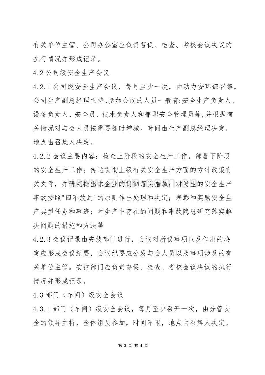 4.2.1公司级安全生产会议,每月至少一次,由动力安环部召集,公司生产副总经理主持。参加会议的人员一般有:安全生产负责人、设备负责人、安全员、技术负责人和兼职安全管理员等,并根据有关情况对与会人员按需要随时增减。时间由生产副总经理决定,地点由召集人决定。