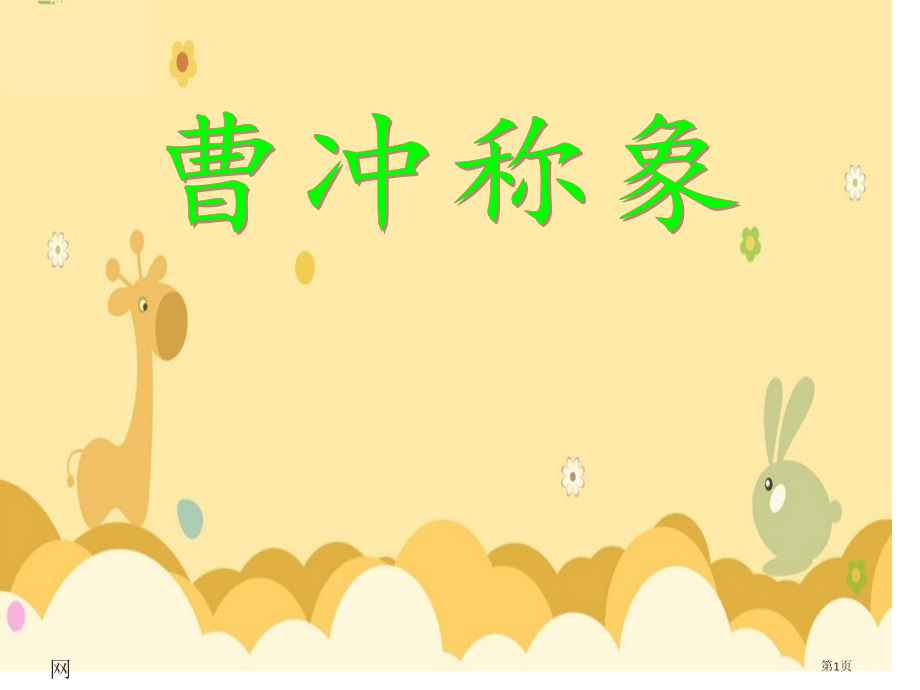 ,*,*,*,网,曹冲称象,第1页,第一课时,第2页,一、猜谜语,耳朵像扇子,,鼻子像钩子,,大腿像柱子。,(,打一动物,),第3页,第4页,大象是陆地上最大动物,现存大象仅两种,非洲象和亚洲象。非洲象体型较大,最大雄象约,7,吨重,雌雄象都长有发达象牙;亚洲象略小,最大体重约,5,吨,仅雄象才长有发达象牙。象鼻子粗大,但能拾取针等细小物件。象听力很强,能听出森林中各种声响,能够在,5,公里内听出水声音。不过它视力极差,是著名“近视眼”,对静止不动东西只能看到,10,米远,即使活动东西也只能看到,30,米远。,第5页,大象看样子它很迟钝,其实很聪明,性格善良而温顺,经过训练能通晓人意,不但能学会不少技艺,能演出舞蹈、吹口琴、摇铃等节目,还能为主人运输、驮人、伐木、垦荒、搬运重物等工作。,大象寿命可长达70岁以上,小象要经过14才成熟,一只母象一生只能生56只小象,所以繁殖率较低。而人们为了获取象牙常加以猎杀,如今世界已不足7.5万头大象。所以必须发出呼吁,阻止象牙非法贩卖,以拯救这一濒危动物。,第6页,二、初读课文,整体感知。,1,、同学们边听课文朗诵边思索,课文主要讲了一件什么事?,2、自读课文,学习生字。,(1)用自己喜欢方法读课文,同时用曲线在文中标出生字词。,(2)同桌交流,再读课文,扫除字词障碍。(自读、小组读、分段读),第7页,曹,称,员,柱,议,论,重,三、记忆字形,指导书写,1、检验生字自学情况,co chng yn zh y,ln zhng,gn chng kn do g xin zh,ling,杆,秤,砍,倒,割,线,止,量,第8页,2、指导写字,(1)出示我会写,9,个生字,(2)教师范写田字格中生字,学生书空。,候、柱、底、杆、秤、岁、站、船、然、,第9页,hu,组词:问候 守候 部首:亻,结构:左右结构,候,第10页,zh,组词:柱子 石柱 部首:木,结构:左右结构,柱,第11页,d,组词:月底 到底 部首:广,结构:左上包围结构,底,第12页,j,组词:拉杆 旗杆 部首:木,结构:左右结构,杆,第13页,chng,组词:秤钩 压秤 部首:禾,结构:左右结构,秤,第14页,su,组词:岁月 周岁 部首:山,结构:上下结构,岁,第15页,zhn,组词:车站 站岗 部首:立,结构:左右结构,站,第16页,chun,组词:渡船 游船 部首:舟,结构:左右结构,船,第17页,rn,组词:自然 显然 部首:灬,结构:上下结构,然,第18页,四、总结全文。,学了这一课,你学到了什么?,第19页,第二课时,第20页,一、复习上节课学过生字,1、全体学生朗诵字词。,曹,称,员,柱,议,论,重,co chng yn zh y,ln zhng,gn chng kn do g xin zh,ling,杆,秤,砍,倒,割,线,止,量,第21页,二、课文新授,曹冲(196年8月21月),字仓舒,是曹操儿子之一,由曹操小妾环夫人所生。曹冲从小聪明仁爱,与众不一样,深受曹操喜爱。建安十三年(公元2),曹冲病重不治而逝世,年仅十三岁。,第22页,故事介绍,课文主要讲了曹冲小时候想方法称象故事。,第23页,时间:,古时候,人物:,曹操、曹操儿子、官员,事情起因,第一自然段:曹操率领儿子和官员去看人家送给他一头大象。,第24页,第二自然段:大象又高又大,官员们在议论大象重量。,第25页,大象又高又大,身子像一堵墙,腿像四根柱子。,官员们一边看一边议论:“象这么大,到底有多重呢?”,一边,一边,第26页,这头大象怎么样?,又高又大。,你是从哪些话中看出大象又高又大?,身子,像,一堵墙,腿,像,四根柱子。,“像,像,”,这两个比喻句把大,象高大写既生动又形象。,第27页,大象身子像一堵墙。,第28页,大象腿像四根柱子,第29页,官员们在议论什么?,这么大象,到底有多重,?,第30页,第三自然段:官员们想出了哪些称象方法?,第31页,大象那么大。怎么称出它重量呢?,官员,1,官员,2,曹 冲,第32页,官员,1,n chn,一 杆 秤,第33页,可是没有些人提得动那么大秤。,第34页,zi,宰,官员,2,第35页,曹操听了,直,摇头。,为何,直,摇头?,因为曹操对官员们提出方法不满意。,“直摇头”,不停摇头,说明曹操态度是果断反正确。,第36页,这个方法太糟糕。会伤害大象。,赶快想方法,第37页,第四自然段:,曹冲提出称象方法。,第38页,曹冲想出了好方法。,第39页,“,我有个方法。把大象赶到一艘大船上,看船身下沉多少,在船舷上画一条线作记号,再把大象赶上岸,往船上装石头,等船下沉到画线地方为止。然后,称船上石头就行了。石头有多重,大象就有多重。”,第40页,第41页,第42页,第43页,称出每块石头重量,第44页,=,第45页,曹操高兴地点点头。他叫人照曹冲说方法去做,果然称出了大象重量。,第46页,用“先,再,然后,最终,”,叙述称象过程。,想一想,第47页,经过这一自然段学习,你看出了,曹冲是一个什么样人?,非常聪明 善于观察,爱动脑筋 思索问题,我长大了,要做一个,人。,第48页,布置作业,曹冲用石头代替大象方法称出了大象重量。假如当初你也在,同学们,你还能想出其它好方法吗?,第49页,同学们,再见,第50页,