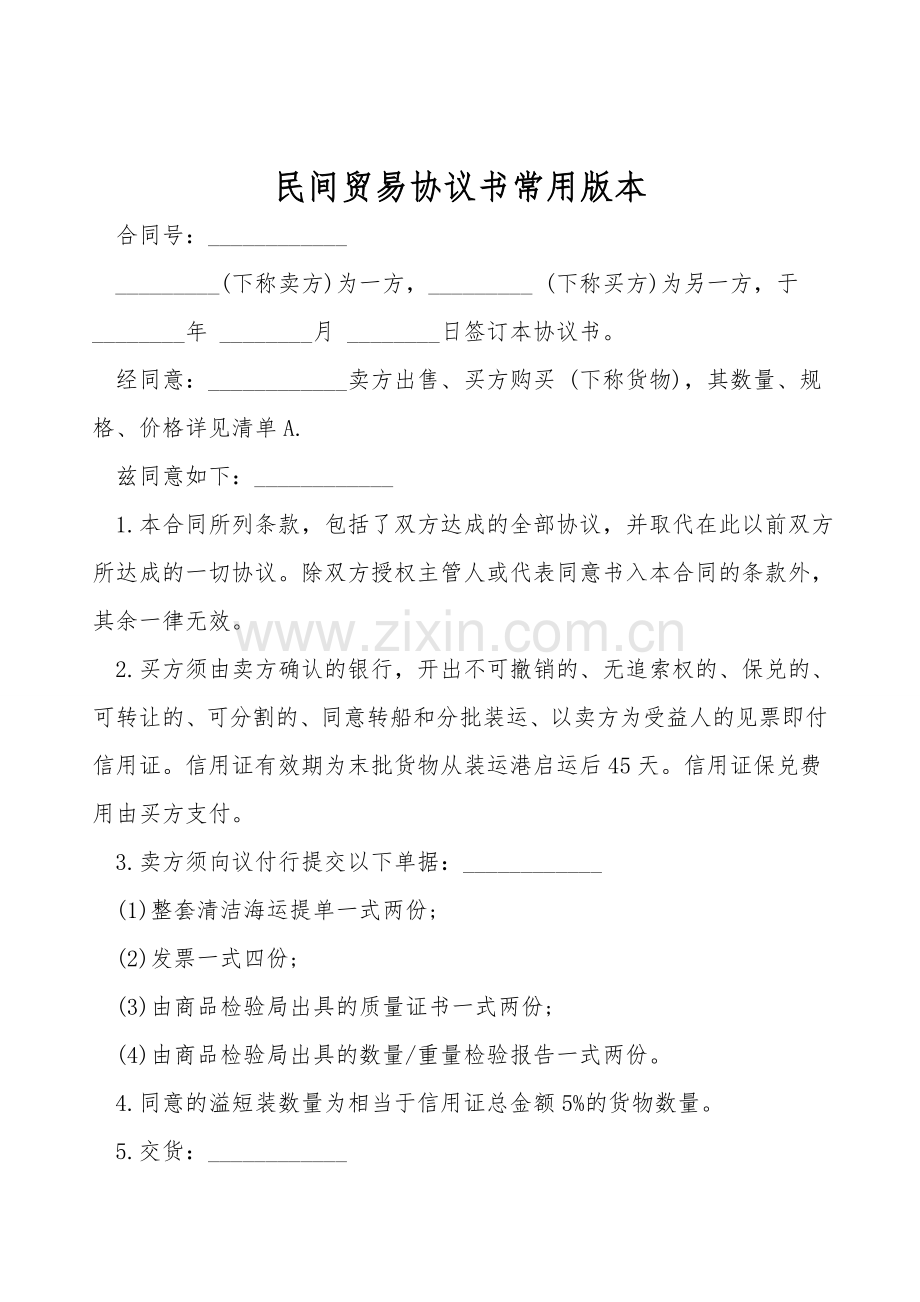 民间贸易协议书常用版本