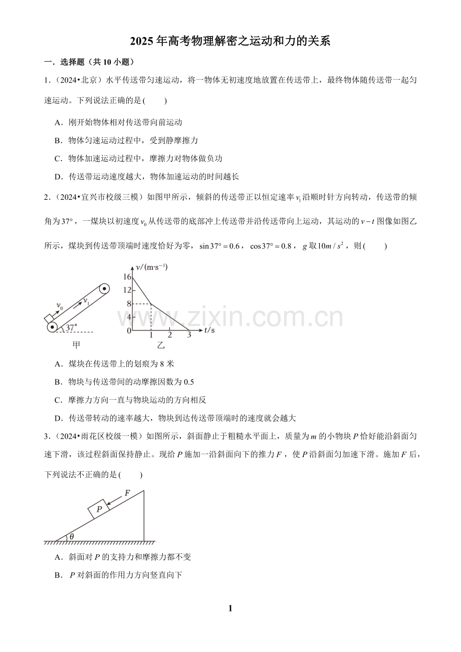 1.(2024•北京)水平传送带匀速运动,将一物体无初速度地放置在传送带上,最终物体随传送带一起匀速运动。下列说法正确的是