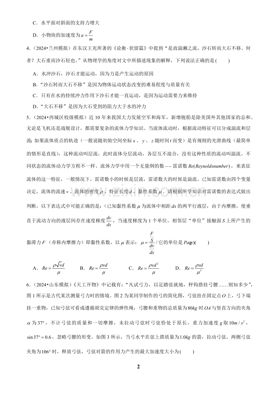 5.(2024•西城区校级模拟)近10年来我国大力发展空军和海军,新增舰船是除美国外其他国家的总和。无论是飞机还是战舰设计,都需要复杂的流体力学知识。当流体流动时,根据流动特征可以分成湍流和层流:如果流体质点的轨迹(一般说随初始空间坐标、、随时间而变)是有规则的光滑曲线(最简单的情形是直线),这种流动叫层流,此时流体分层流动,各层互不混合,没有这种性质的流动叫湍流。不同状态的流体动力学方程不一样。流体力学中用一个无量纲的数雷诺数,来表征流体的这一特征,一般情况下,雷诺数小的时候是层流,雷诺数大的时候是湍流。已知雷诺数由四个变量决定,流体的流速、流体的密度、特征长度,黏性系数.请根据所学知识对雷诺数的表达式做出判断,以下表达式中可能正确的是:(已知黏性系数为流体中相距的两平行液层,由于内摩擦,使垂直于流动方向的液层间存在速度梯度,当速度梯度为1个单位,相邻层“单位”接触面上所产生的黏滞力(亦称内摩擦力)即黏性系数,以表示:它的单位是
