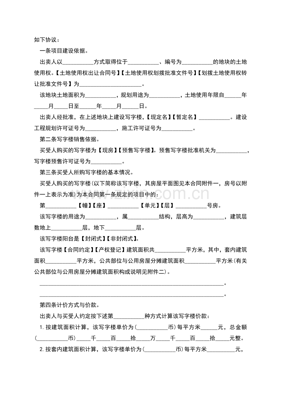 1.按建筑面积计算,该写字楼单价为(___________币)每平方米______元,总金额(___________币)_____千_____百_____拾_____万_____千_____百_____拾_____元整。