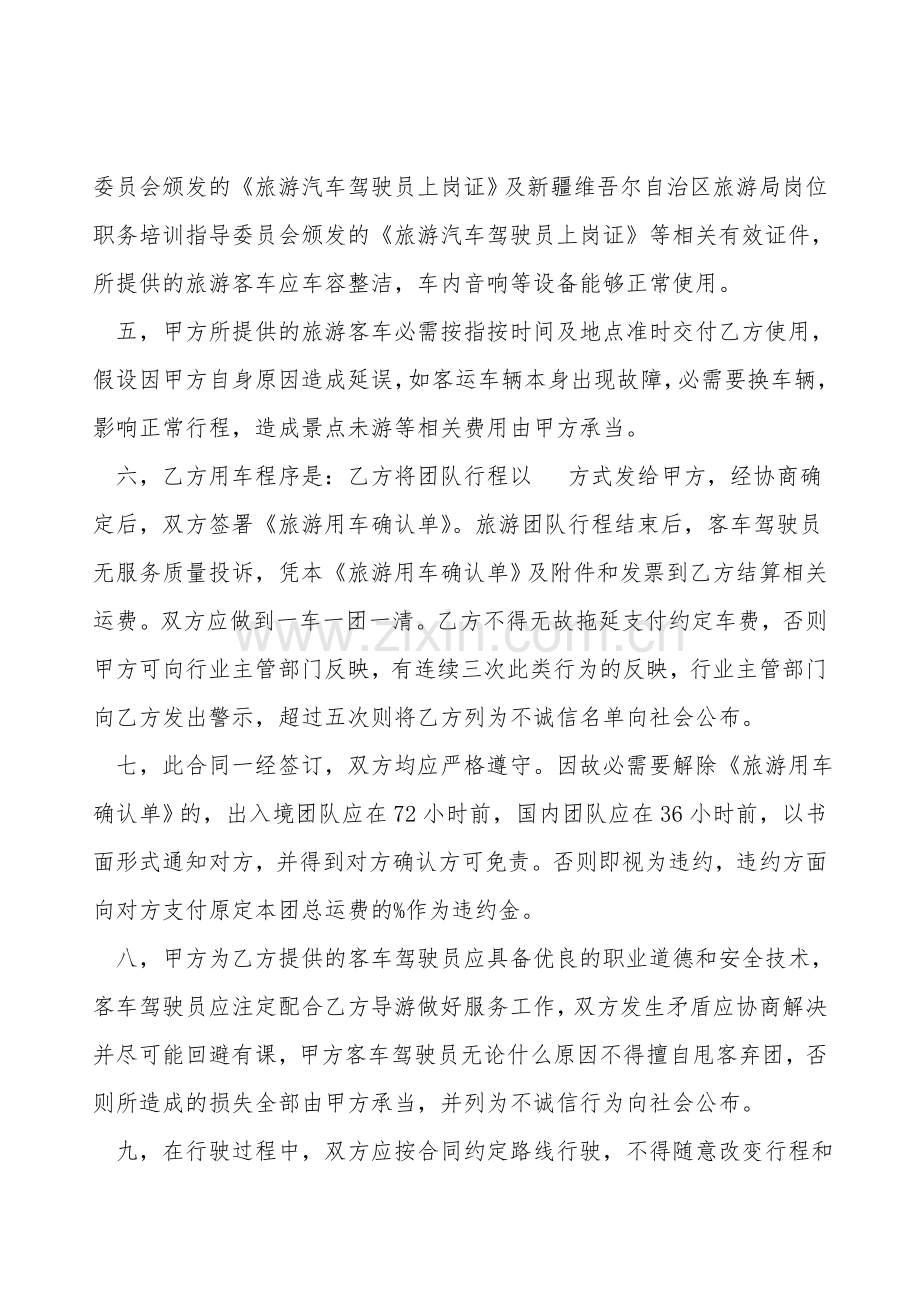 三,甲方所属旅游客车必需具备有效的行车执照和运管部门颁发的《道路运输证》,〔旅游〕包车标志牌等旅游客运营运手续,该客运车辆应按规定足额办理相应的保险{承运人责任险〔每座位保险数额不少于10万元〕}.