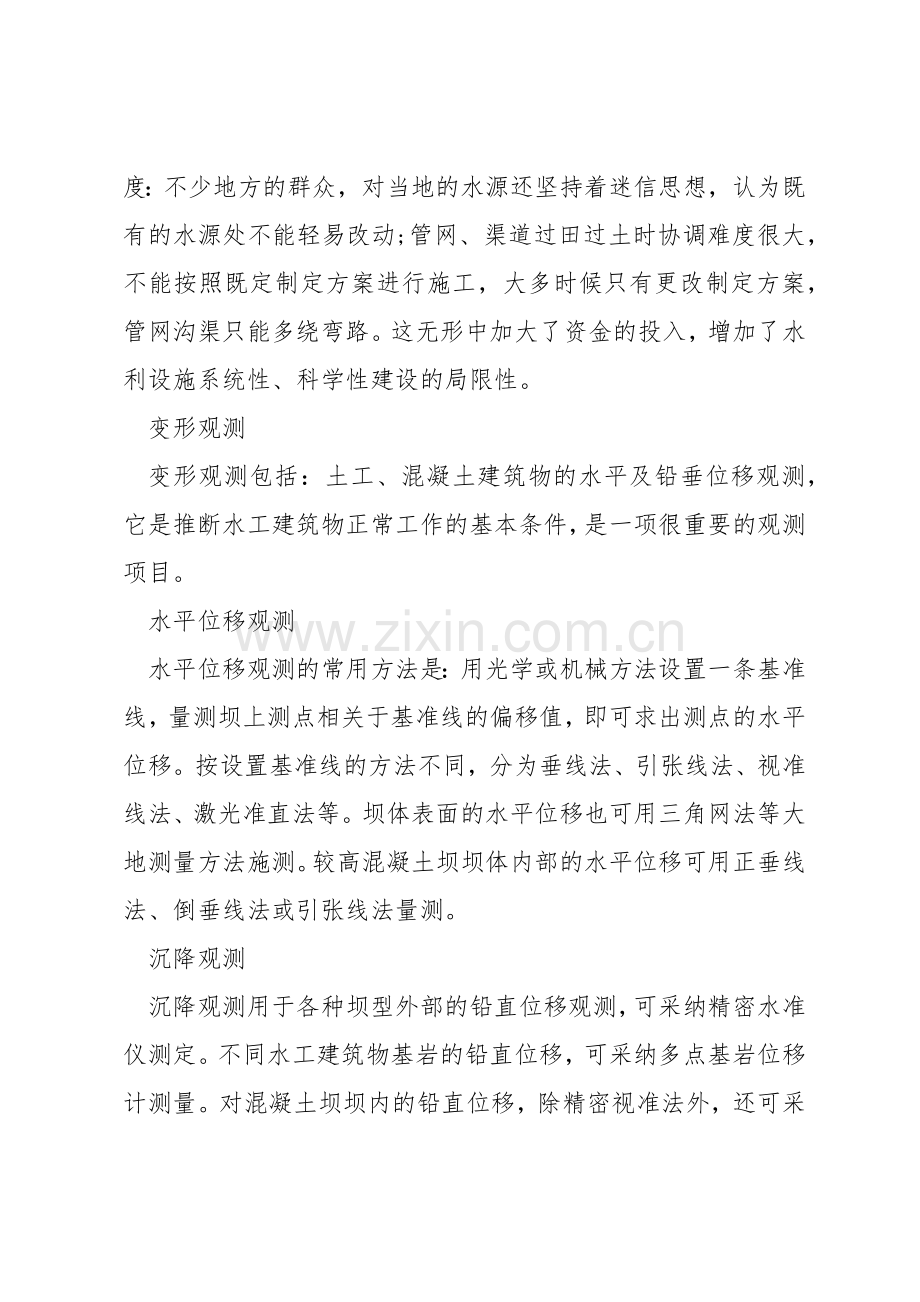 变形观测包括:土工、混凝土建筑物的水平及铅垂位移观测,它是推断水工建筑物正常工作的基本条件,是一项很重要的观测项目。