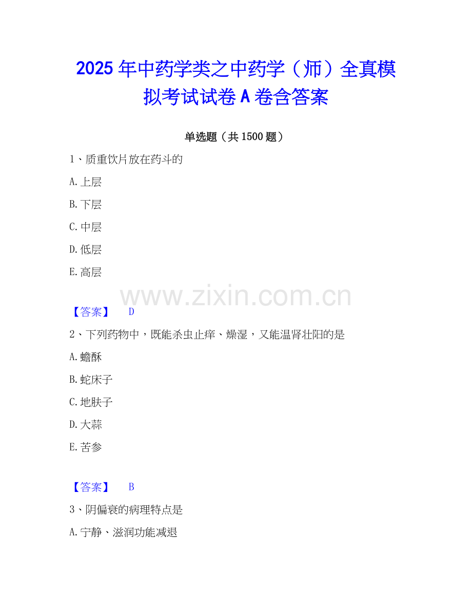 2025年中药学类之中药学(师)全真模拟考试试卷A卷含答案