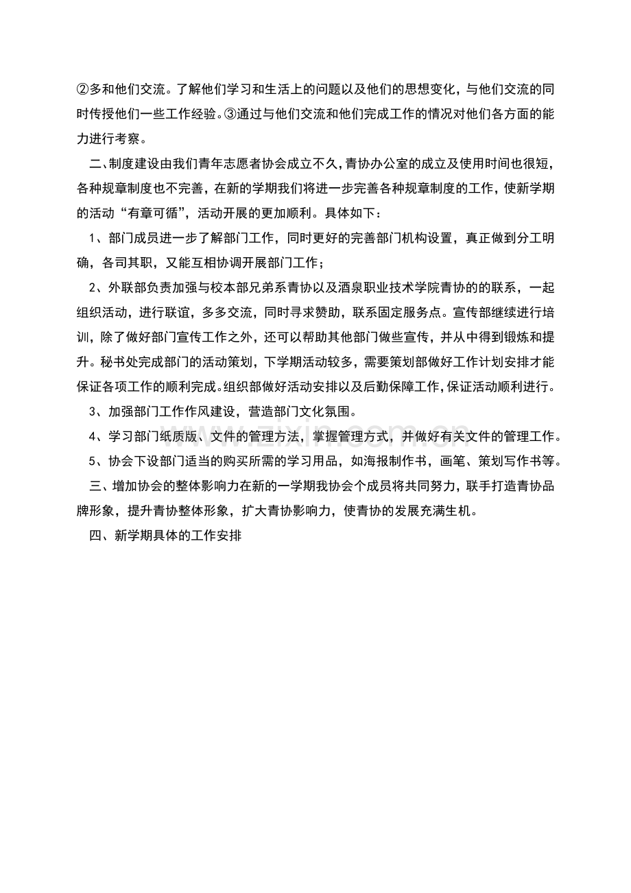三、增加协会的整体影响力在新的一学期我协会个成员将共同努力,联手打造青协品牌形象,提升青协整体形象,扩大青协影响力,使青协的发展充满生机。