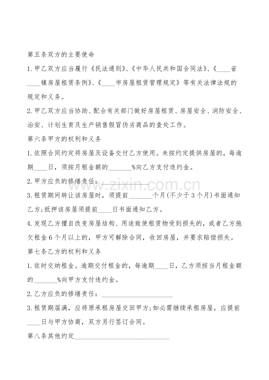 1.甲乙双方应当履行《民法通则》、《中华人民共和国合同法》、《____省____镇房屋租赁条例》、《____市房屋租赁管理规定》等有关法律法规的规定和义务。